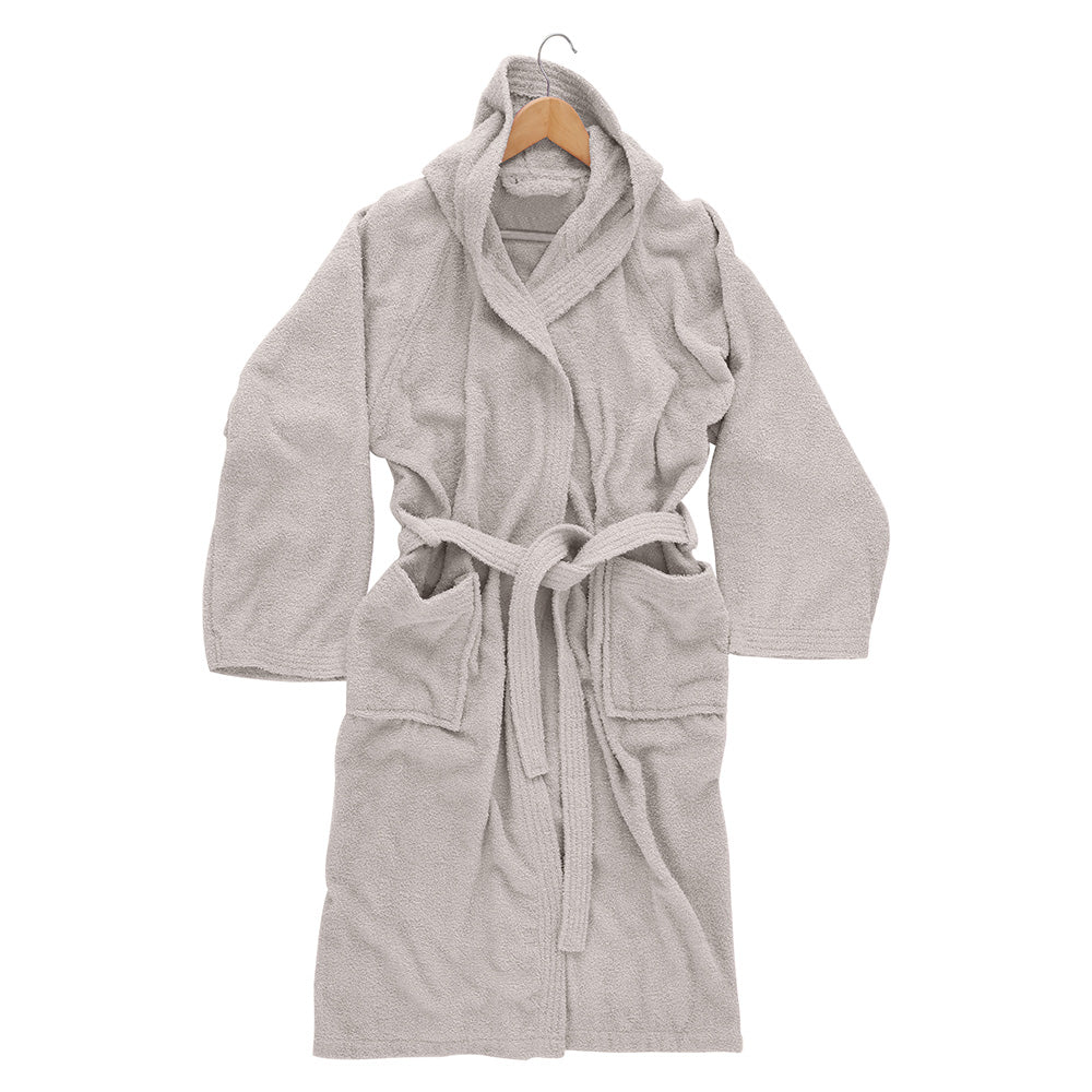 Accappatoio 100% cotone con cappuccio, cintura da annodare e tasche applicate. Peso 340 gr/mq.