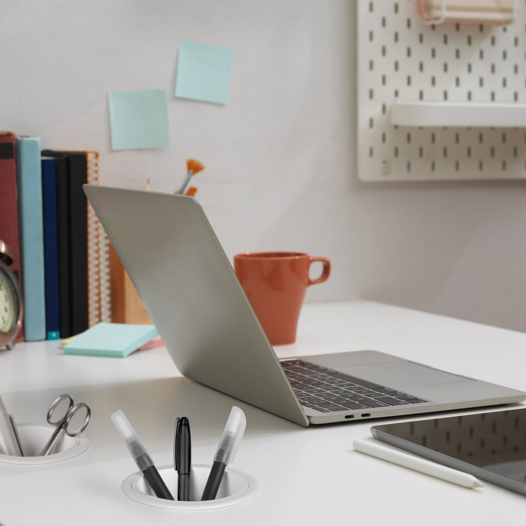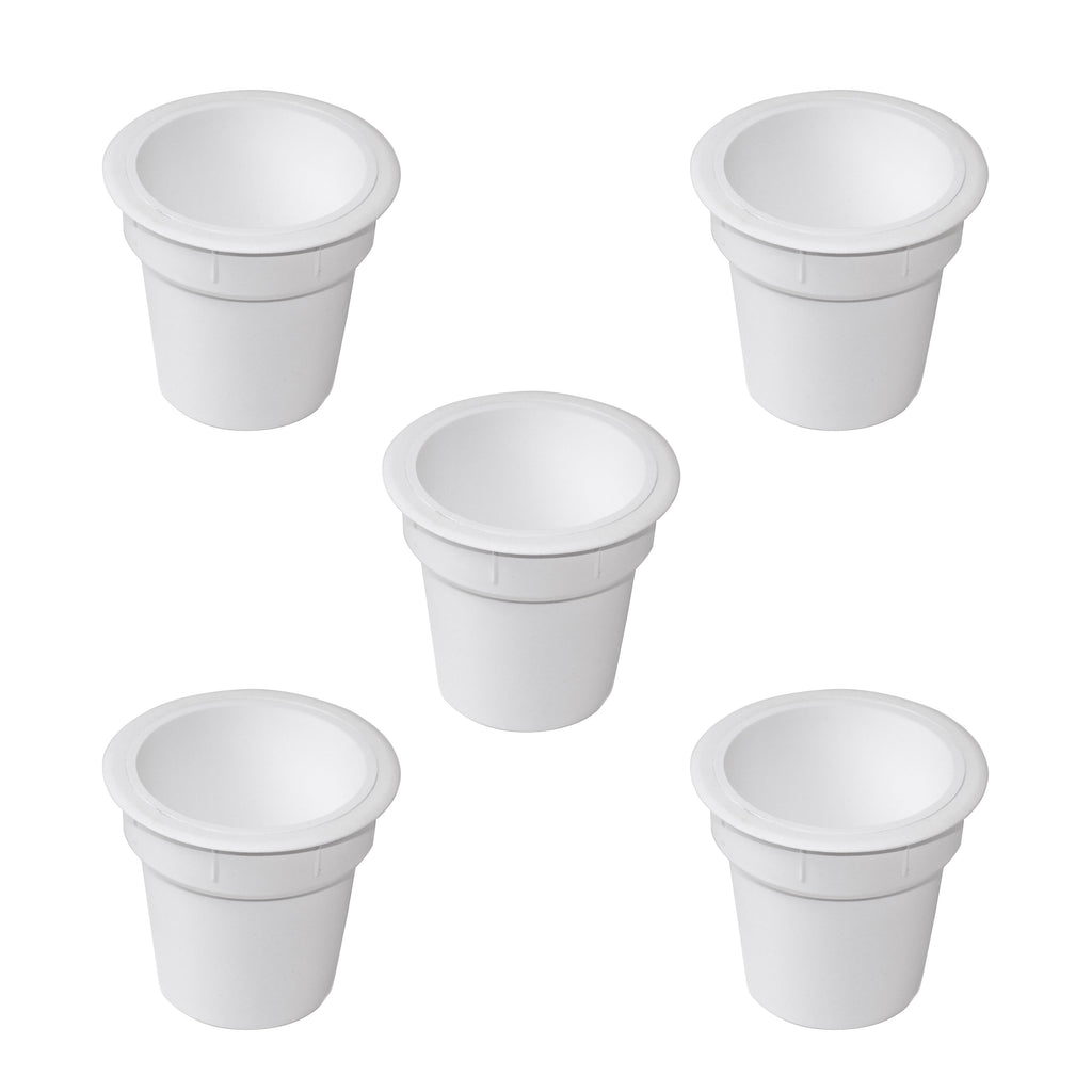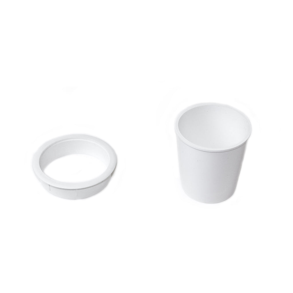 L'accessorio Pot può essere utilizzato come portaoggetti, portapenne o come pratico vaso di fiori.È composto da un anello e da un secchio facilmente rimovibili per la pulizia e lo spostamento. Richiede una lavorazione di Ø80mm per poterlo inserire nel mobile. Entrambi sono disponibili con finitura nera o bianca e sono venduti in lotti da 5 accessori.