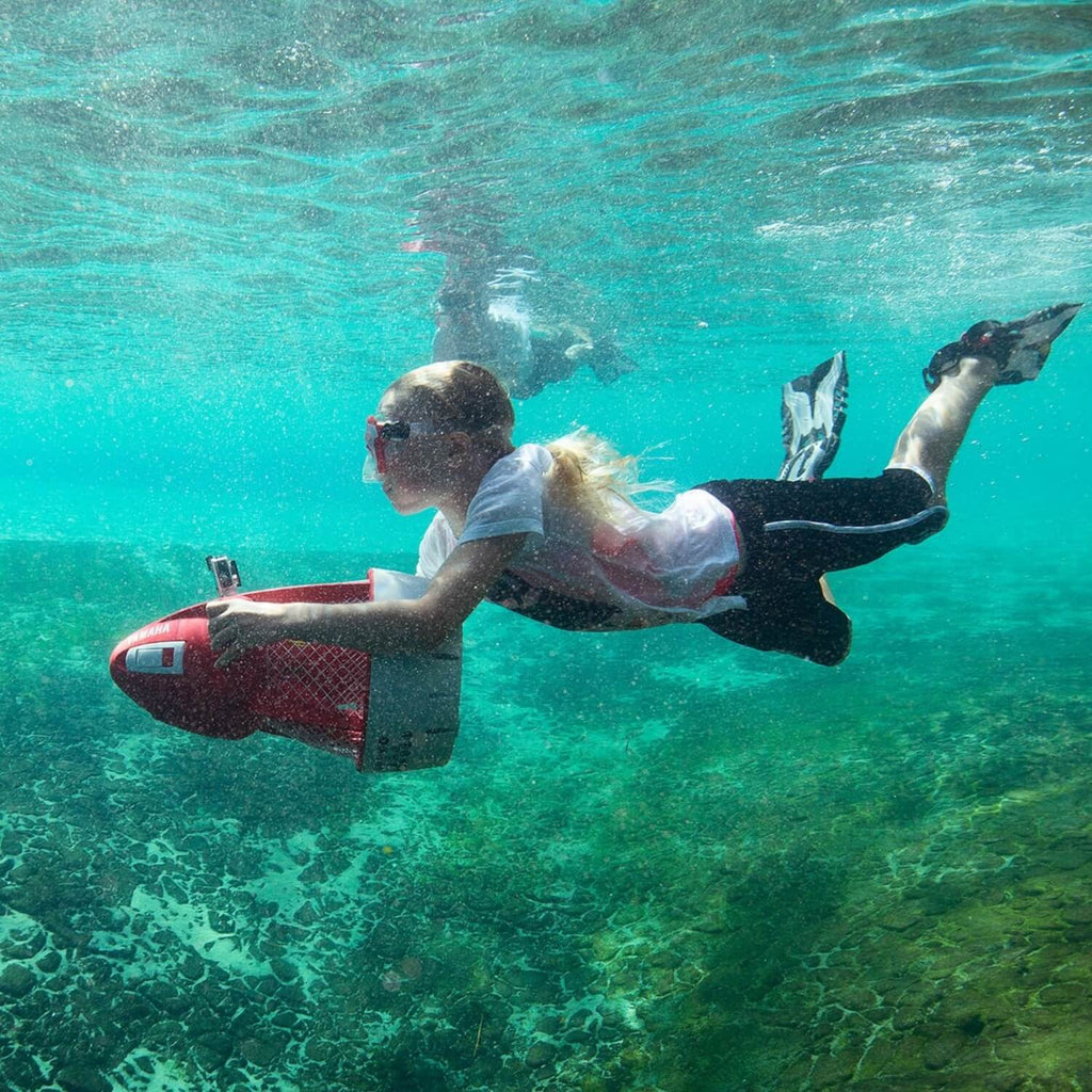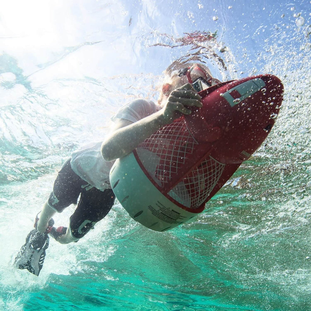 trasporta i subacquei attraverso l'acqua, ottimo per avviare i bambini alle prime avventure di Snorkeling o alle prime immersioni fino a 5mt di profondità, oppure per passare 90 min di divertimento con una sola carica al mare al lago o in piscina.