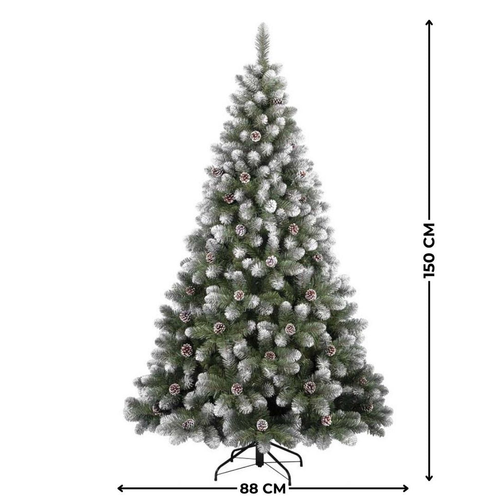 Albero di Natale Artificiale alto 150cm con 361 rami addobbato con punte innevate e pigne