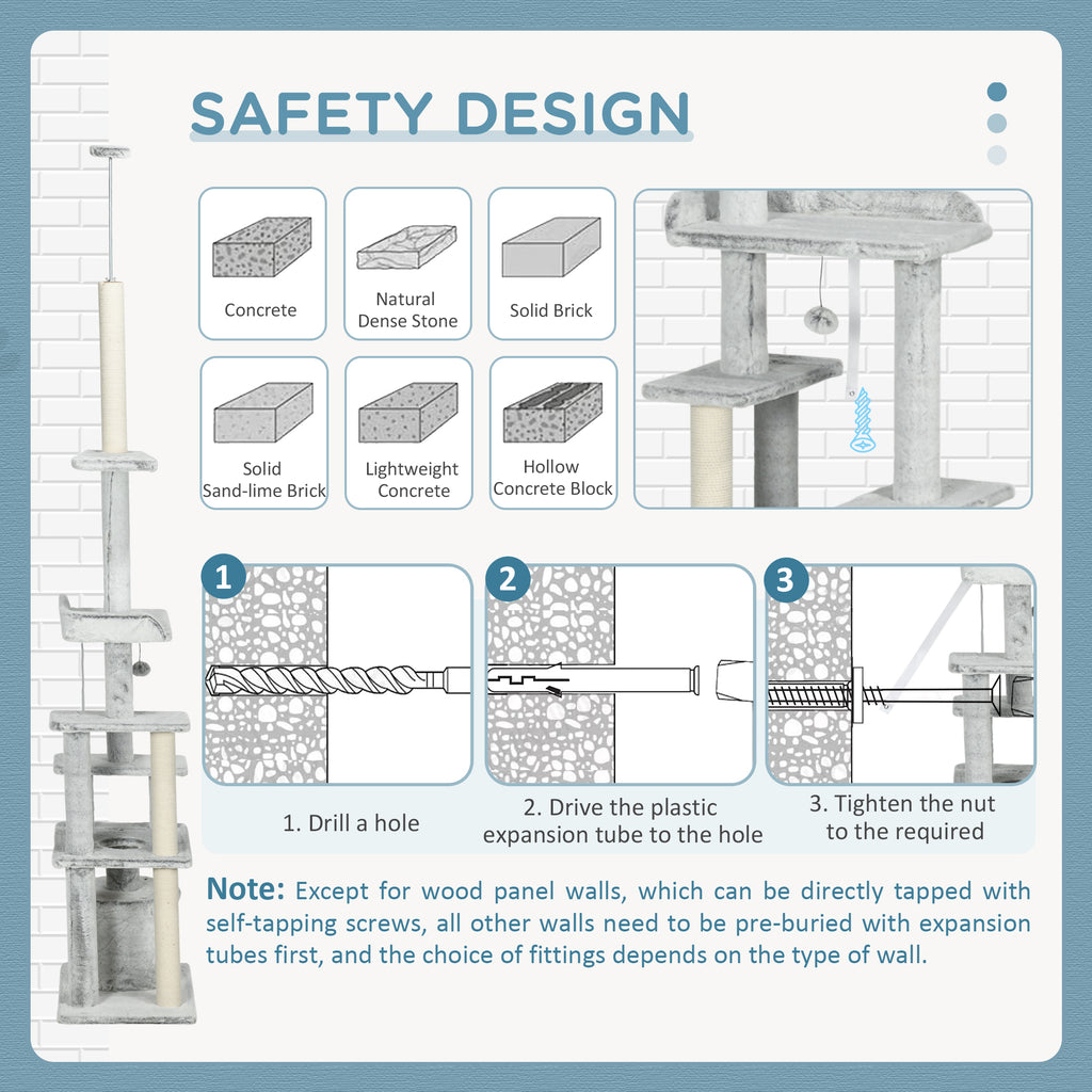Dai ai tuoi gatti un posto tutto loro con questo albero tiragraffi progettato per ospitare fino a 3 mici! La struttura si estende dal soffitto al pavimento, per mantenerla stabile e resistere ai salti dei gatti. Con diverse piattaforme su cui rilassarsi e una comoda casetta, questo albero per gatti è la soluzione perfetta per regalare uno spazio in cui giocare e riposare. Inoltre, i pali tiragraffi soddisferanno la loro voglia di affilare gli artigli!