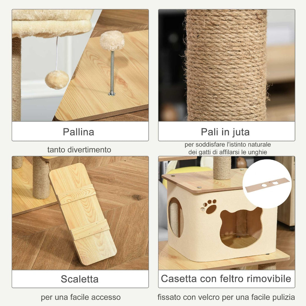 - TUTTO IN UNO: Questo albero per gatti è dotato di pali tiragraffi con corda in juta, piattaforme, amaca, casetta e scaletta per far divertire e riposare i tuoi animali.