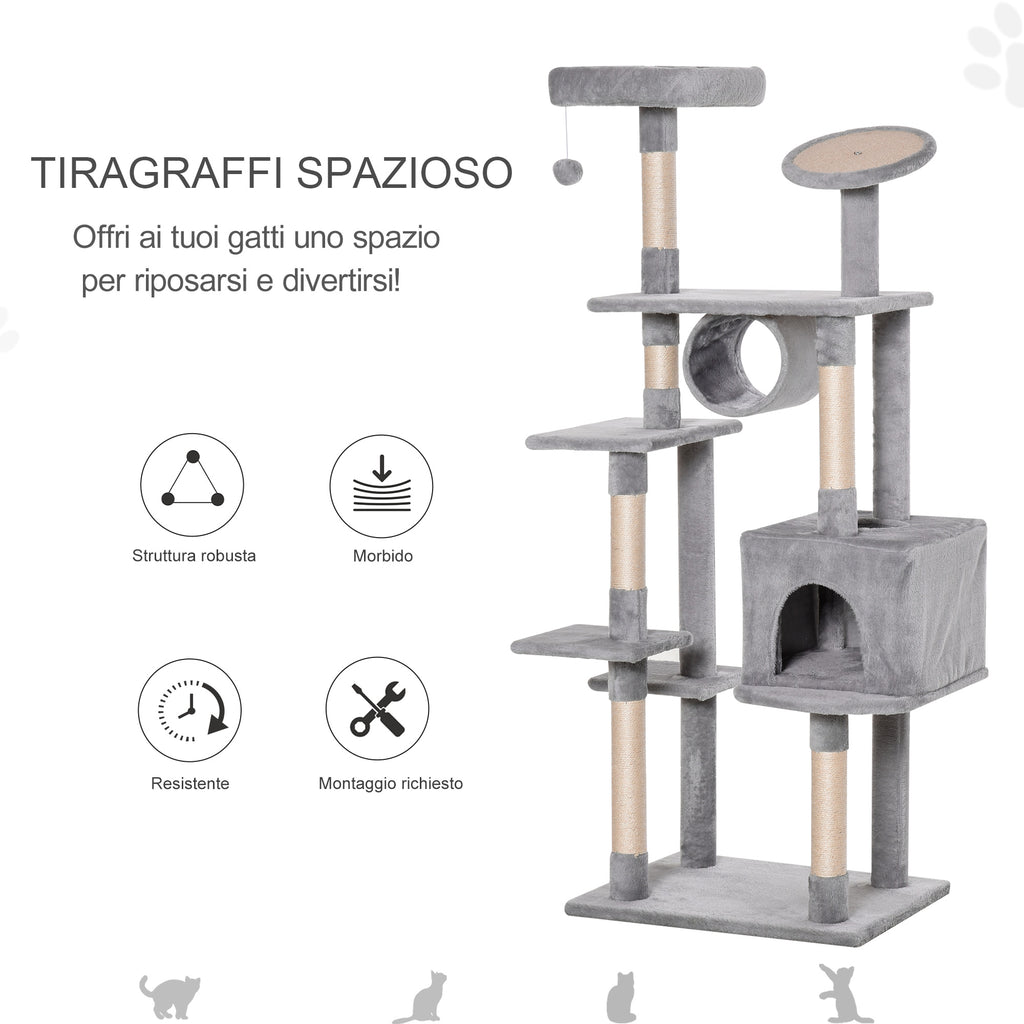 Albero Tiragraffi per Gatti 60x50x165 cm in Peluche e Corda Sisal Grigio e Beige
