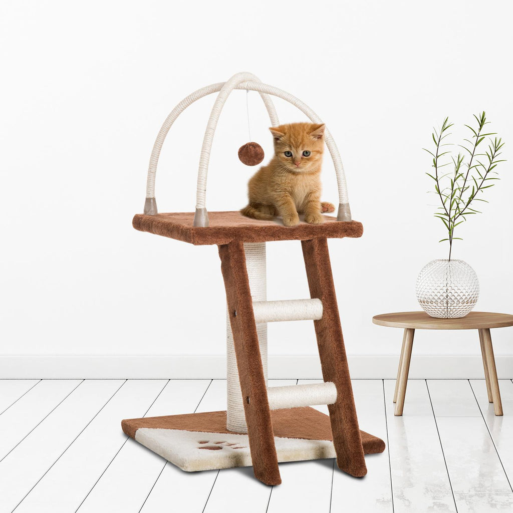 Albero Tiragraffi per Gatti con Scala e Palline in Legno Sisal Marrone e bianco 40x40x70 cm