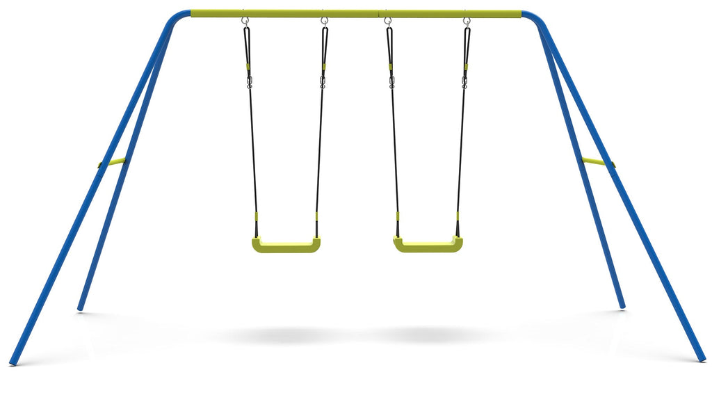 La struttura è in acciaio, con doppio sediolino in plastica. Il diametro dei tubolari è di 50 mm.In colore blu, per la struttura, e verde per i sediolini dell'altalena.