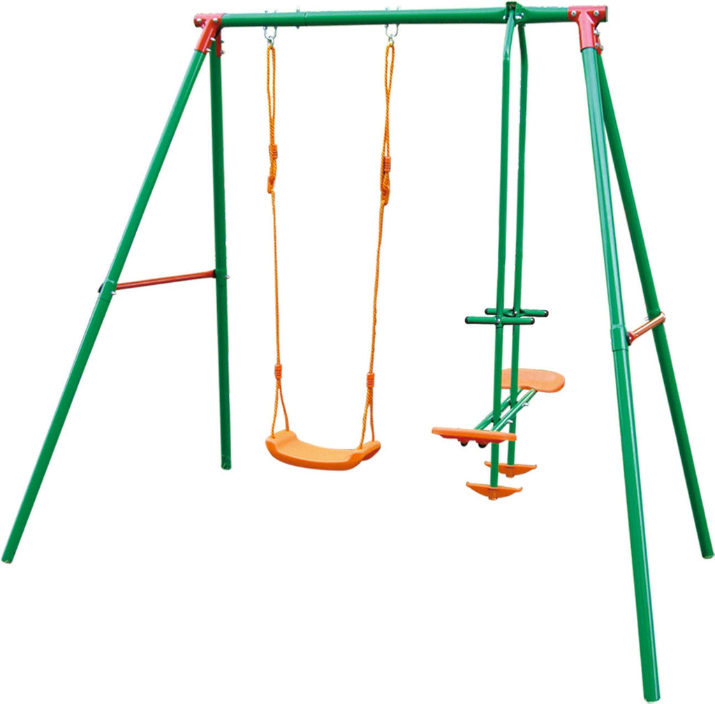 Altalena ad un tiro in acciaio verniciato con un posto e cavallina, adatta per bambini di età compresa tra 3 e 10 anni.