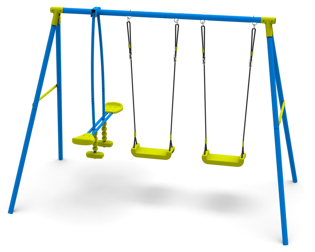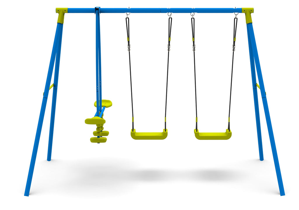 Per giocare da soli, in coppia e addirittura in tre: l'altalena trio include due sediolini e un dondolo, per giocare anche da piccolissimi insieme agli amici e ai fratellini.