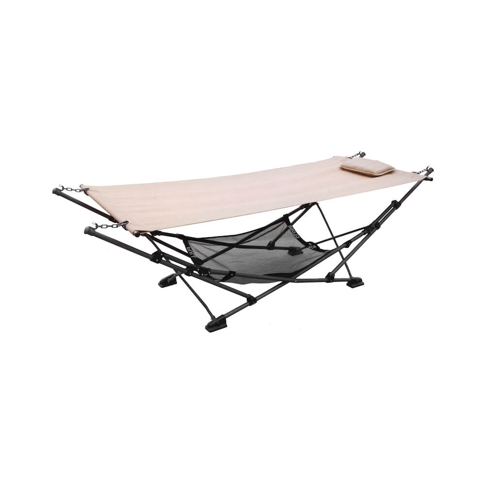 Amaca con supporto pieghevole a pantografo, compresa di cuscino e rete portaoggetti, struttura in Ferro, tessuto Textilene 2X2 gr. 650/mq rivestito in PVC.cm 200 X 90, paleria d. mm 25-16