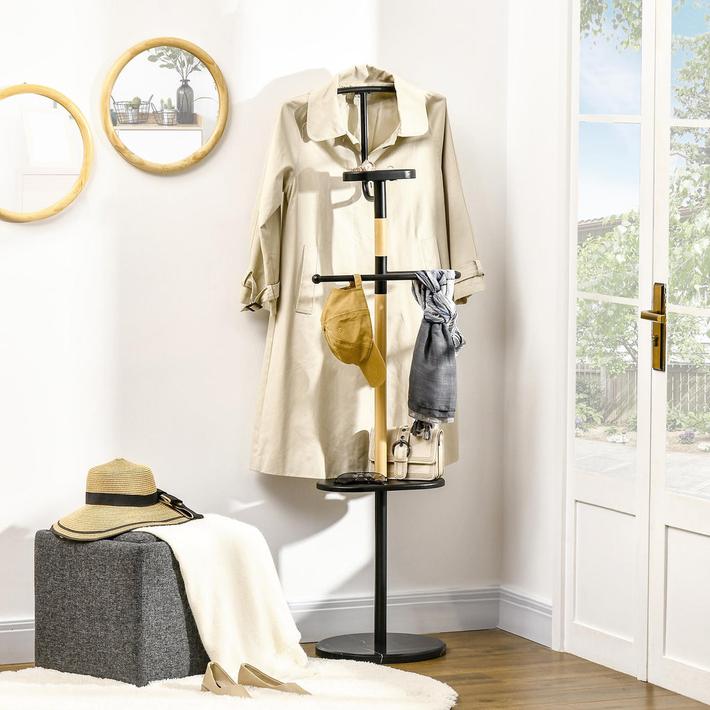 - SPAZI PER RIPORRE: L'albero appendiabiti da terra è dotato di diversi spazi in cui riporre vari oggetti. La gruccia superiore ti permette di appendere cappotti e giacche, la barra centrale offre spazio per posizionare pantaloni, sciarpe e altri indumenti. È presente anche una piccola mensola in cui riporre accessori o chiavi e una mensola grande ideale per appoggiare la borsa