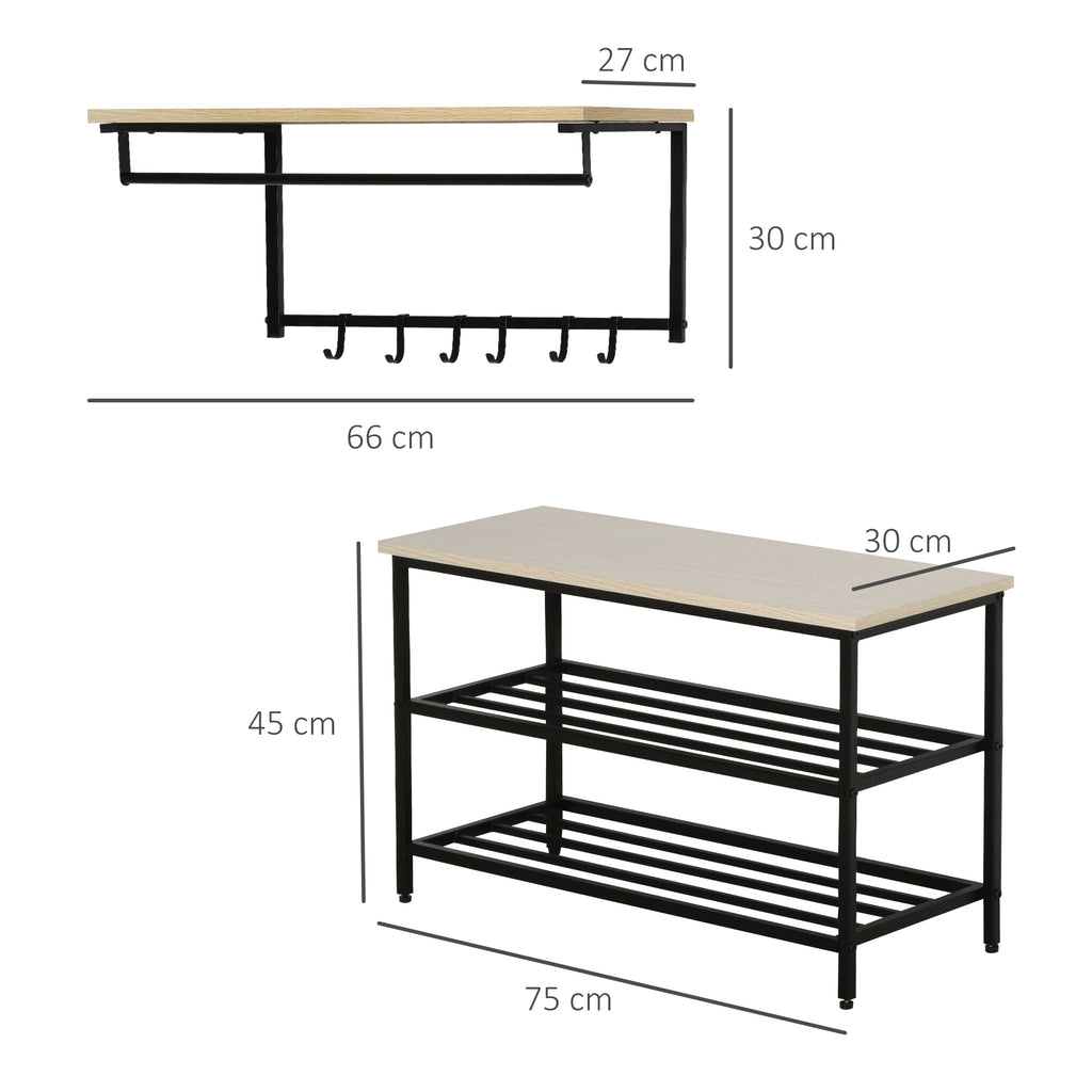 Set appendibabiti e scarpiera , rende cappotti, giacche, sciarpe e altri accessori in ordine! Realizzato in pannello truciolare con superficie in melamina e struttura in metallo, molto durevole e moderno. Appendiabiti con 6 ganci, ripiano e scarpiera con 3 ripiani, soddisfa tutte le esigenze.