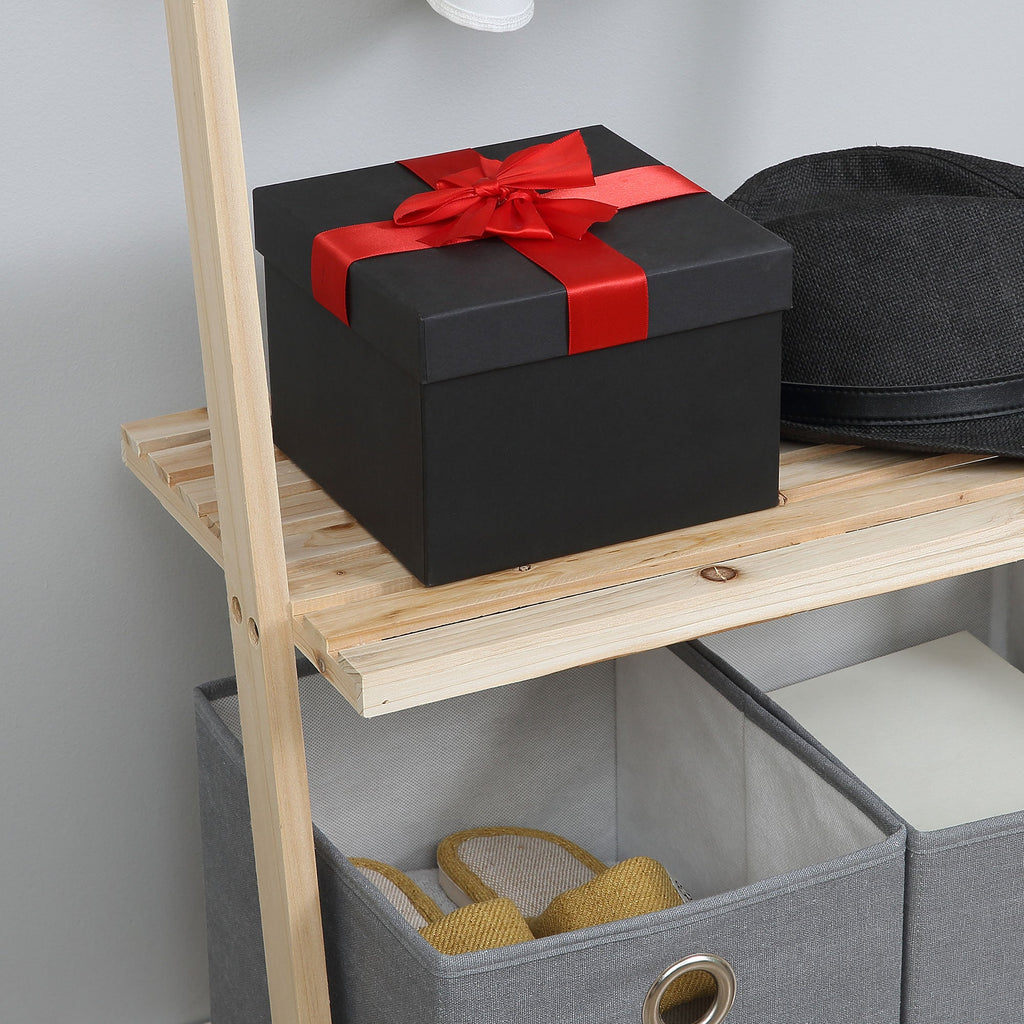 Tieni cappotti, vestiti e borse sempre in ordine con l'appendiabiti . È dotato di 4 ganci e 3 ripiani a doghe, oltre a 2 pratici cestini in tessuto, dove puoi riporre tutto in modo ordinato. L'attaccapanni include un dispositivo antiribaltamento, che garantisce sicurezza e una stabilità ottimale. Lo stile rustico con struttura in legno naturale non verniciato porta un tocco originale in ogni ambiente. Sceglilo per l'ingresso, la camera da letto o il soggiorno!