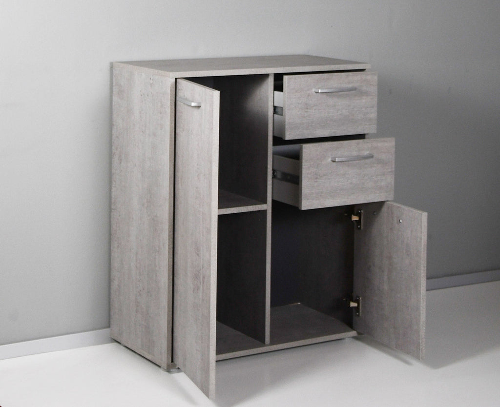 Mobiletto versatile, multiuso e dalla qualità 100% Made in Italy utile, grazie ai suoi vani e cassetti scorrevoli, in soggiorno come piccola credenza per sistemare le stoviglie, in camera da letto come armadietto, all'ingresso oppure in ufficio per conservare documenti e materiale da cancelleria. Superficie rivestita con resina melaminica rende il mobile resistente all'uso quotidiano, agli urti e ai graffi. Il colore grigio effetto cemento dona invece un tocco più moderno all'ambiente e si adatta facilmente a tanti tipi di arredo.
