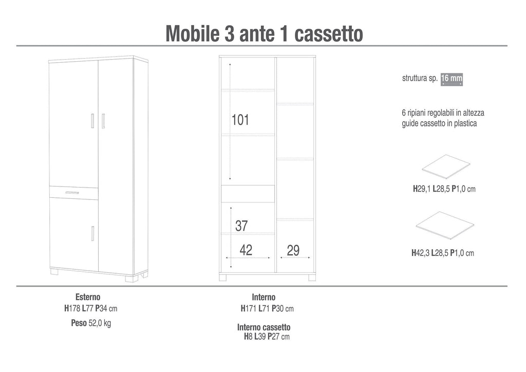 Armadio 3 Ante 1 Cassetto 77x178x34 cm Olmo Chiaro