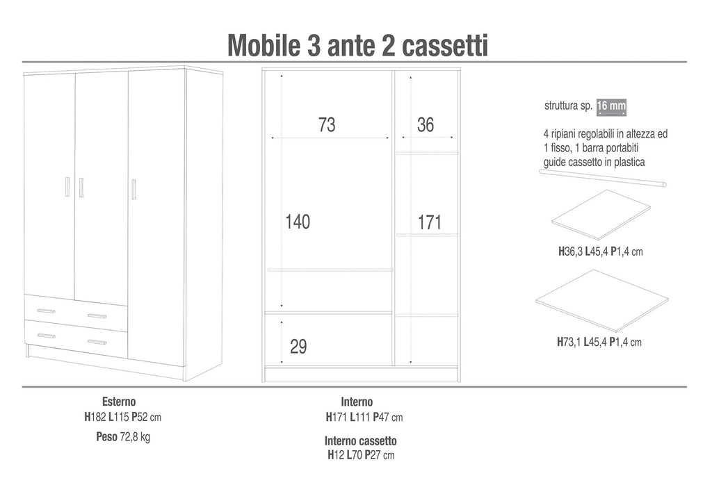 - Contiene 1 barra portabiti, 4 ripiani regolabili