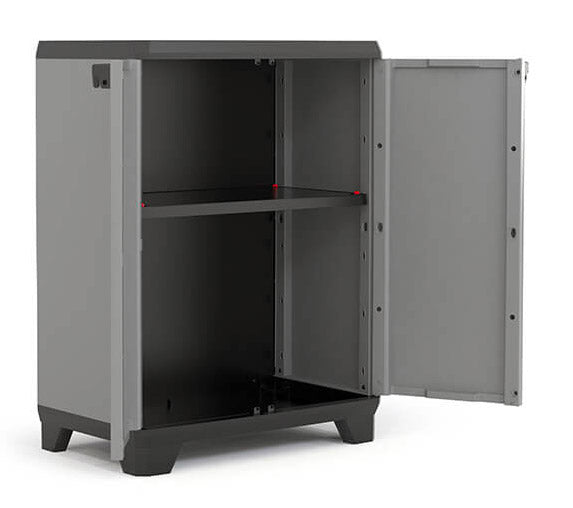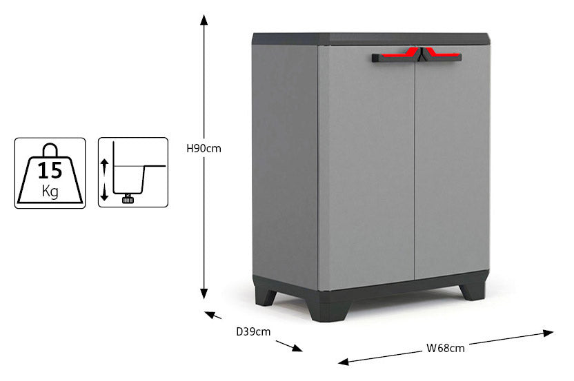 Dotato di un design caratteristico con particolari rossi e neri, l'armadio Stilo Basso comprende un ripiano regolabile con una portata massima di 15 Kg ciascuno, chiusura con predisposizione per lucchetto e maniglie con comoda impugnatura.