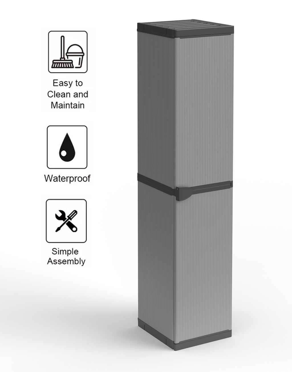 L’armadietto, di dimensioni 34L x 40Px 85H cm, dotato di una singola anta ed un ripiano, è la soluzione perfetta per organizzare e ottimizzare lo spazio di ambienti interni o esterni. I ripiani ed i pannelli sono in resina di PVC; base, copertura superiore, copertura posteriore, montanti e maniglie in resina di PP. Tutti i materiali usati per la realizzazione di questo prodotto sono di seconda vita certificati. Pratico, compatto e semplice da montare. Il montaggio non prevede l’utilizzo di viti o attrezzi ed è spiegato da un foglio di istruzioni illustrato. L’armadietto fa parte della serie Modular System, in quanto è predisposto ad essere unito in serie ad altri articoli della linea Storage del marchio Mongardi.