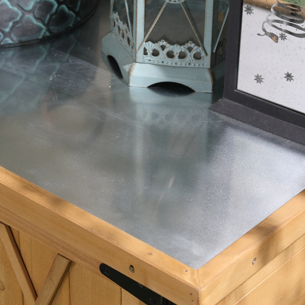 - PIANO DI LAVORO CON LAMIERA: Il piano di appoggio dell'armadietto da esterno è rivestito in lamiera galvanizzata, progettato per resistere agli agenti atmosferici ed evitare infiltrazioni d'acqua che potrebbero danneggiare gli oggetti all'interno