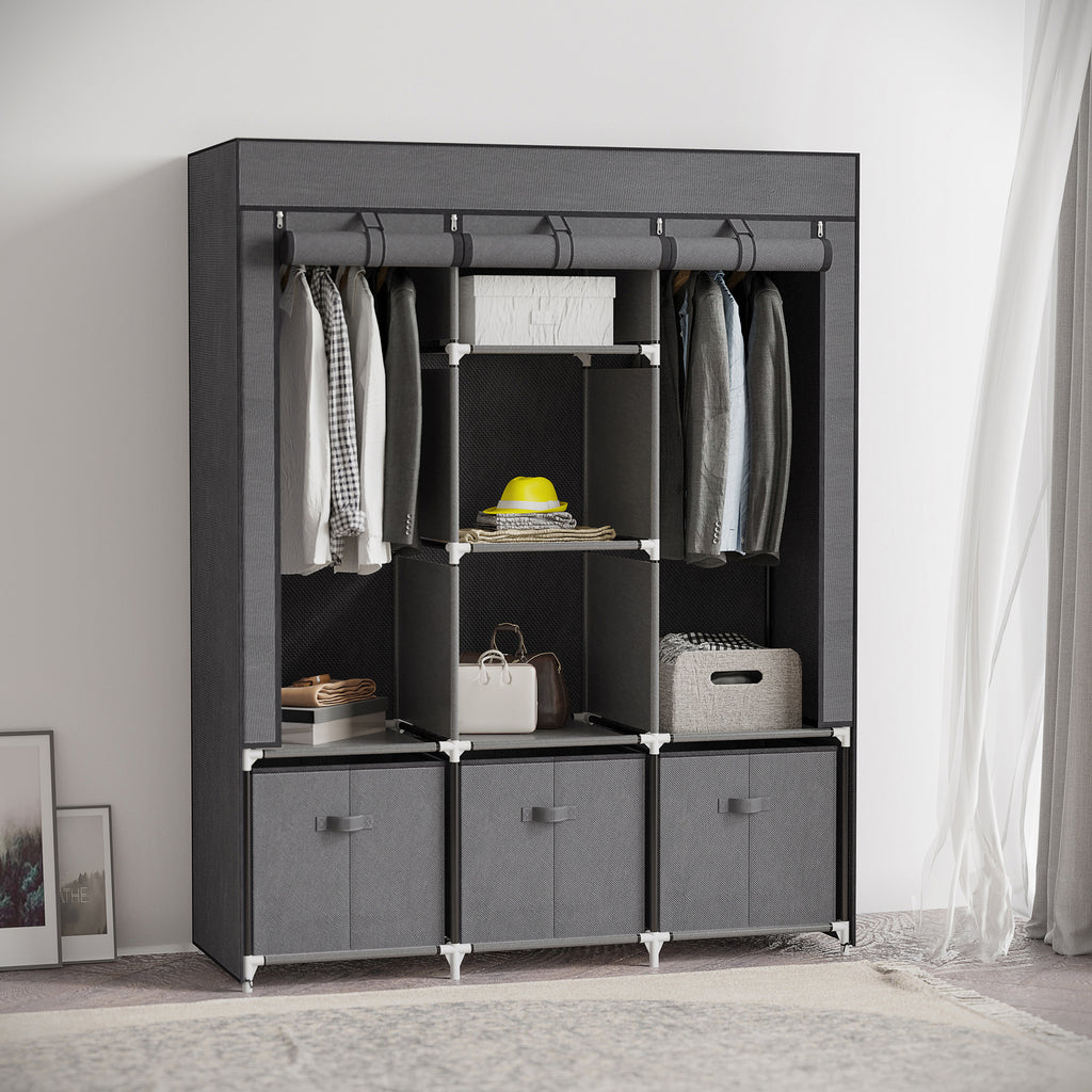 Una soluzione semplice per tenere in ordine i tuoi vestiti, questo armadio in tessuto è un arredo versatile e perfetto per qualsiasi spazio della casa. È dotato di 2 barre appendiabiti, 3 cassetti inferiori e 5 ripiani, perfetti per riporre vestiti, magliette, pantaloni e non solo. Il telaio in acciaio rende la struttura del guardaroba salvaspazio robusta e solida, mentre il rivestimento dell'armadio in tessuto protegge dalla polvere.