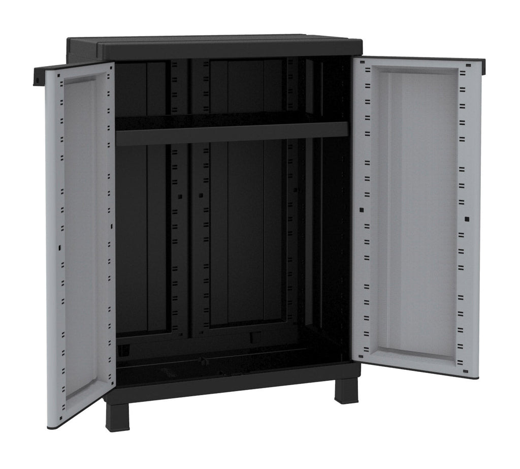 Armadietto a 2 ante con 1 ripiano interno regolabile. Pratica apertura delle ante fino a 180°. Realizzato in Polipropilene con possibilità di chiusura con lucchetto