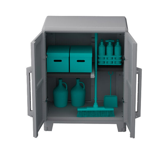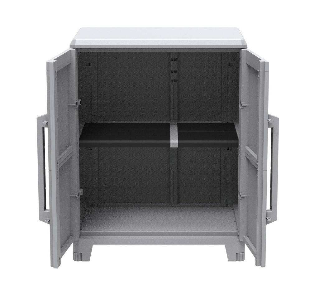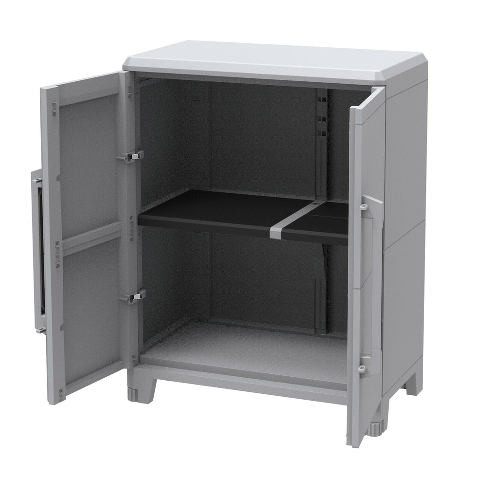 Armadio a 2 ante, con sistema modulabile interno, Ideale per esterni e impermeabile (certificato IP43). Dotato di cerniere in metallo antivento, protezione dai raggi UV e fondo rinforzato con 6 piedini (2 frontali regolabili) e 1 ripiano modulabile di grande portata. Maniglia in bicomponente. Possibilità di chiusura con lucchetto, realizzato i polipropilene.