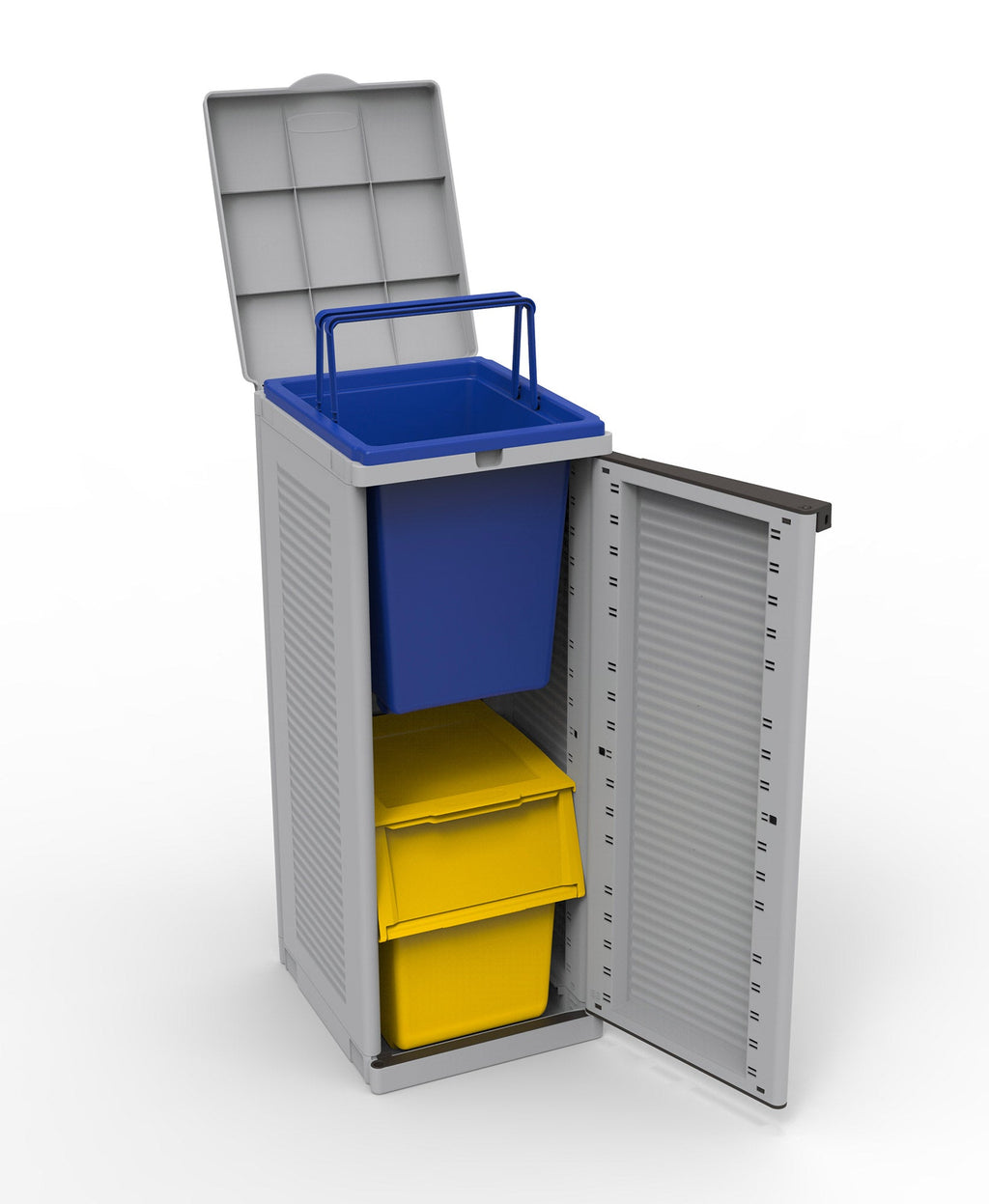 Armadietto ad una anta ideato per la raccolta differenziata dei rifiuti. Dotato di un porta-sacco chiudibile con coperchio. L'apertura delle ante permette una facile estrazione frontale del sacco pieno, ciò lo rende adatto per coloro che hanno problemi di spazio. Materiale in Polipropilene.