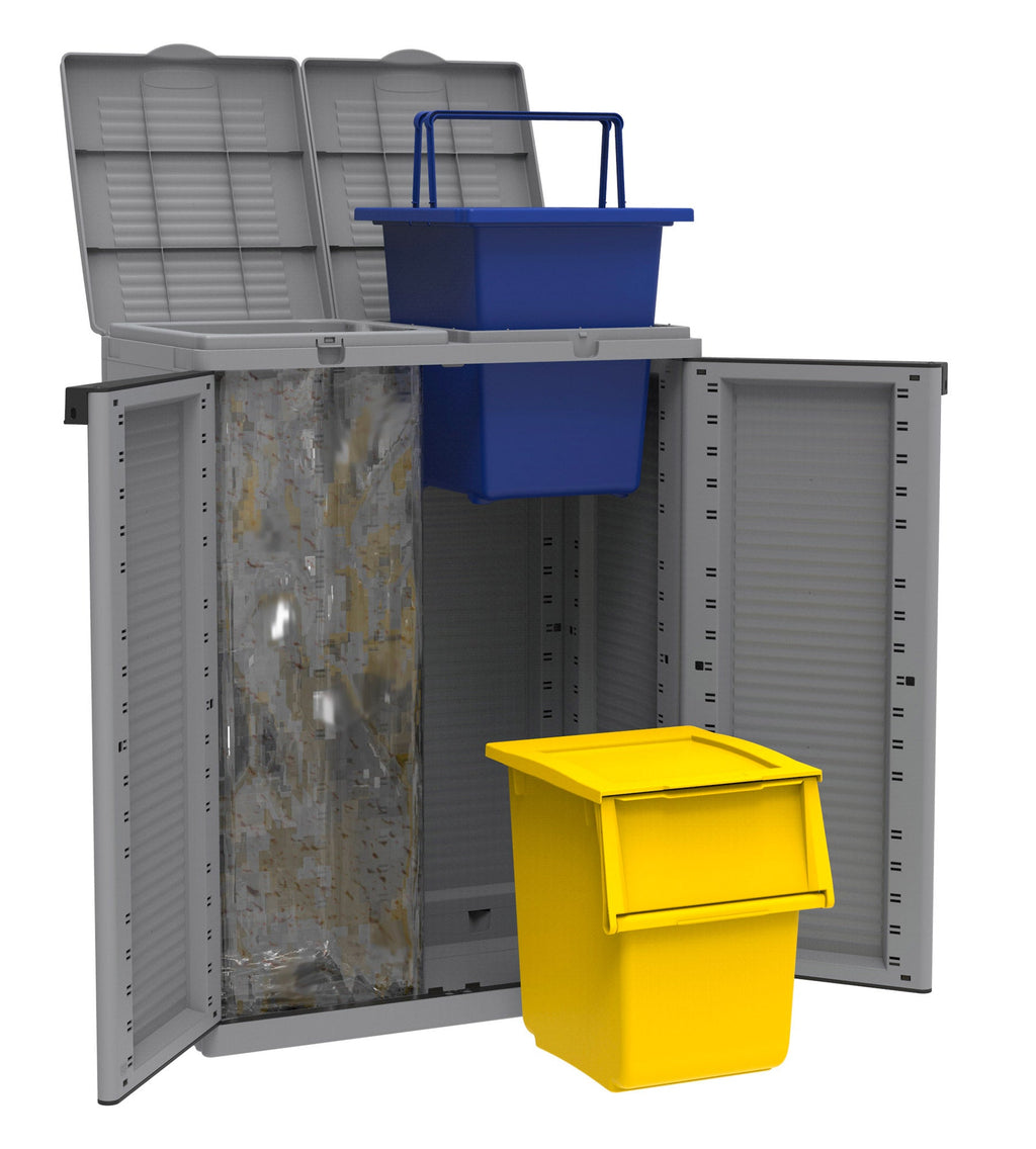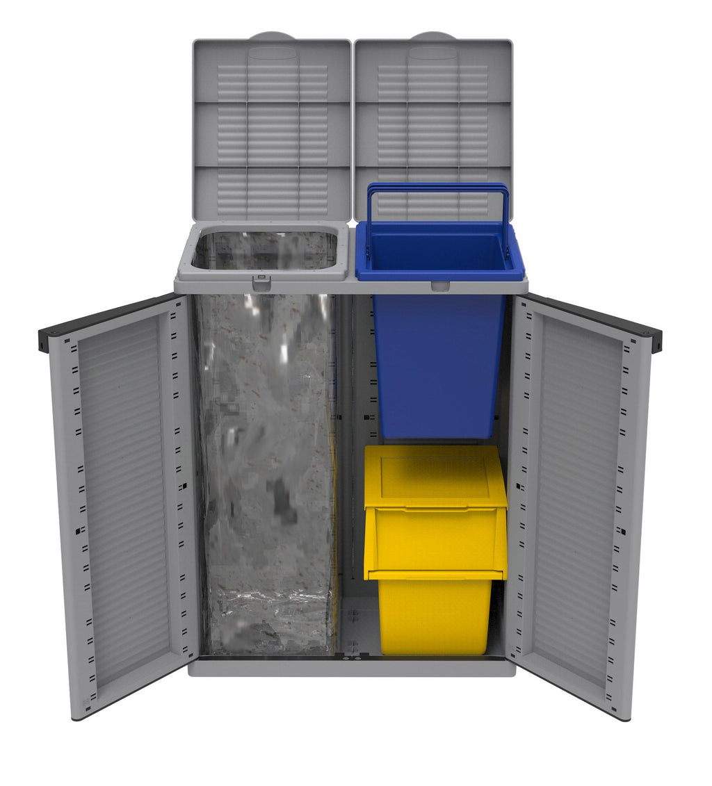Armadietto a 2 ante ideato per la raccolta differenziata dei rifiuti e dotato di due porta-sacco chiudibili con coperchio. L'apertura delle ante permette una facile estrazione frontale dei sacchi pieni, ciò lo rende adatto per coloro che hanno problemi di spazio. Materiale in Polipropilene.