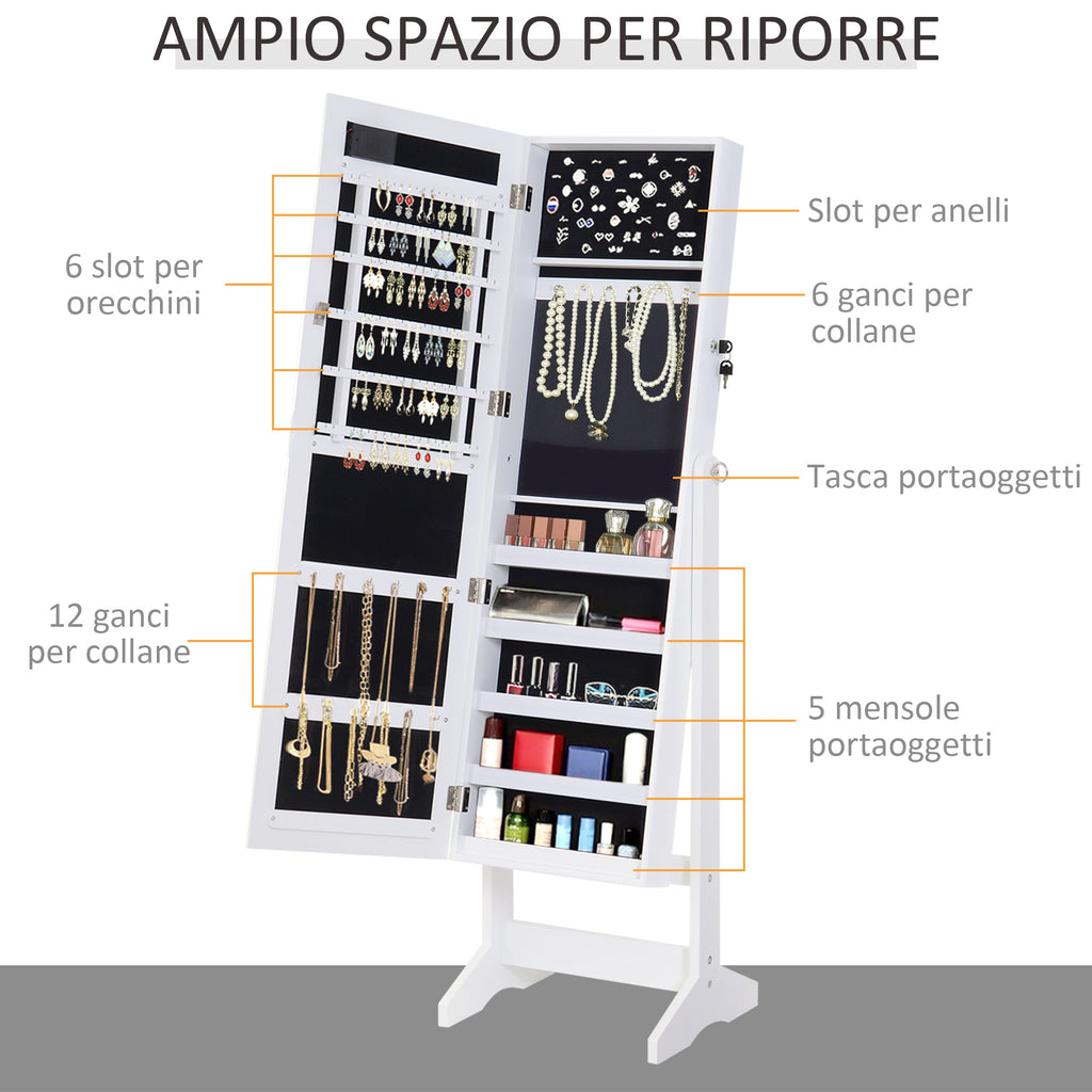 108 slot per orecchini, 18 ganci per collane e braccialetti, 5 ripiani e 1 custodia.