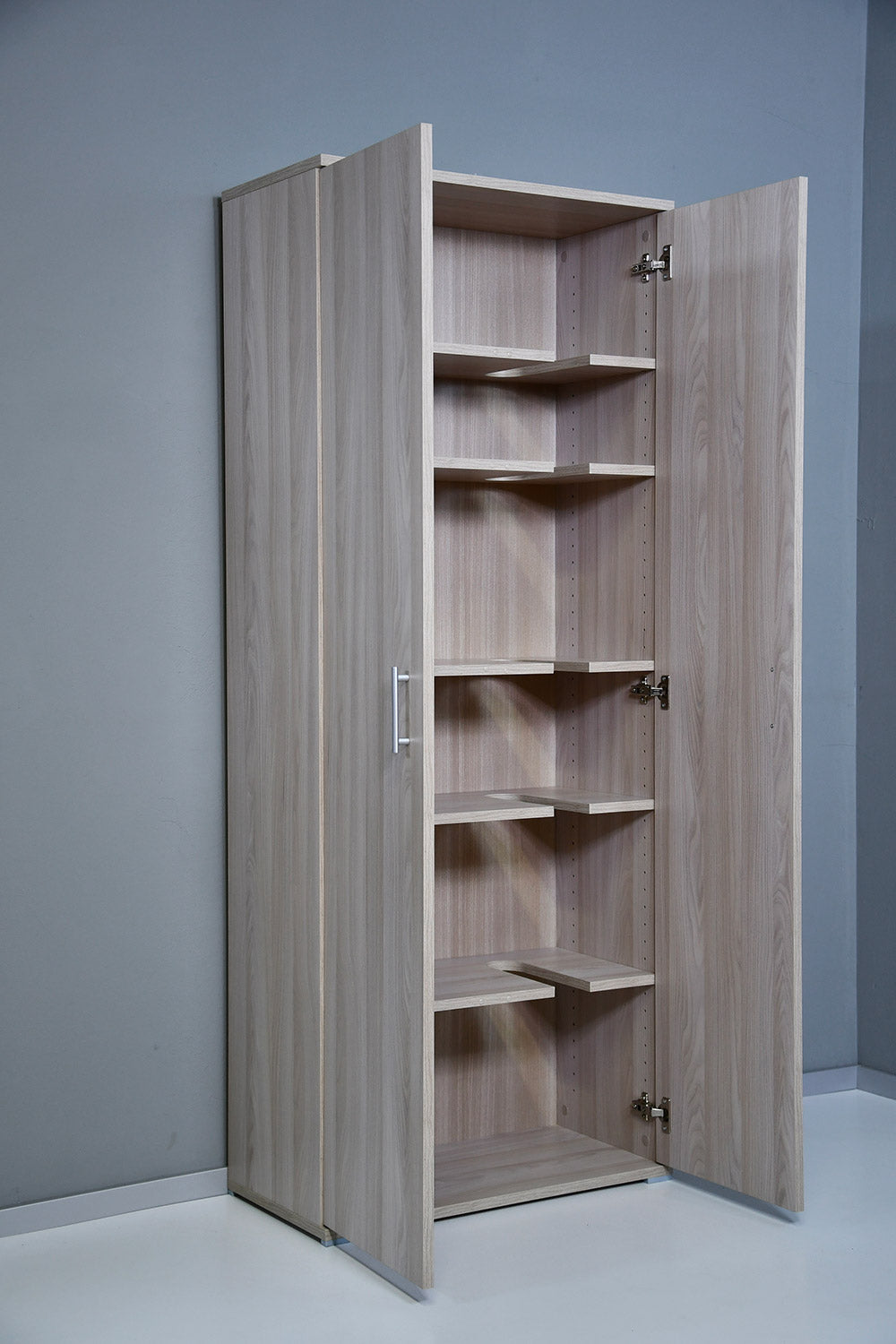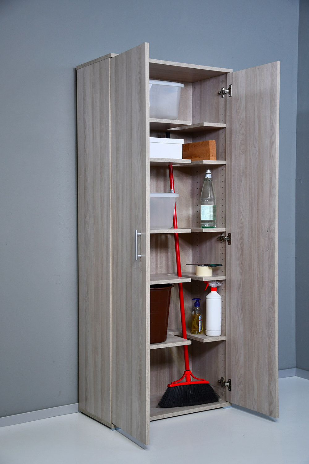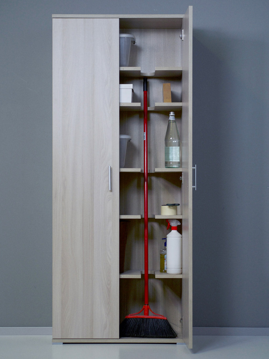 Armadio portascope capiente e funzionale per conservare scope, detersivi, secchi, aspirapolveri, accessori e tutti i prodotti per la pulizia in maniera sicura e ordinata. Struttura solida e durevole, realizzata interamente in Italia con legno truciolare e materiali di prima qualità che garantiscono resistenza agli urti, ai graffi e all’uso quotidiano. All’interno le mensole sono sagomate per i manici delle scope e 6 ampi vani che facilitano l’organizzazione di tutto l'occorrente per pulire gli spazi di casa. Le ante a battente nascondono benissimo il contenuto e il design lineare fa sì che il mobile si adatti perfettamente a qualsiasi angolo della casa.