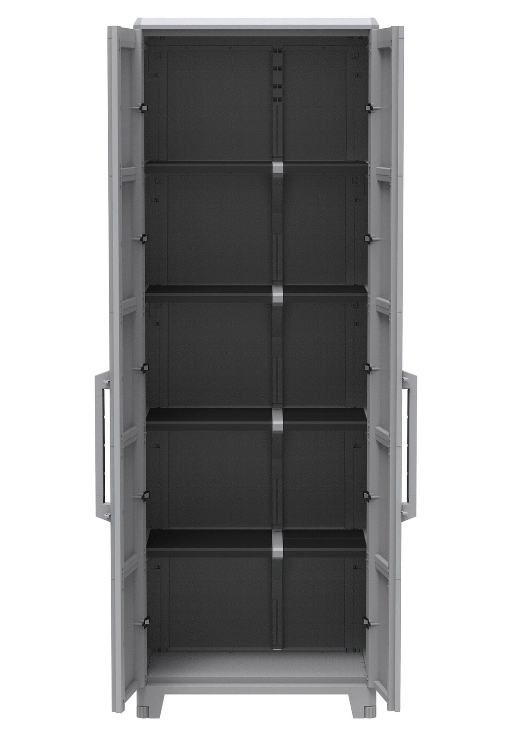 Armadio a 2 ante, con sistema modulabile interno e ideale per esterni e impermeabile (certificato IP43), cerniere in metallo antivento, protezione dai raggi UV. Fondo rinforzato con 6 piedini (2 frontali regolabili) e 3 ripiani modulabili di grande portata. Realizzato in Polipropilene con maniglia in bicomponente e possibilità di chiusura con lucchetto.