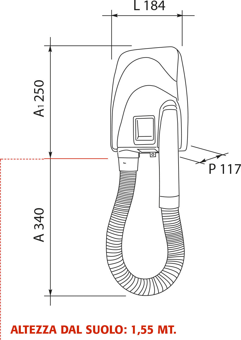 - Dimensione (AxLxP): 250(590 con tubo) x 184 x 117 mm