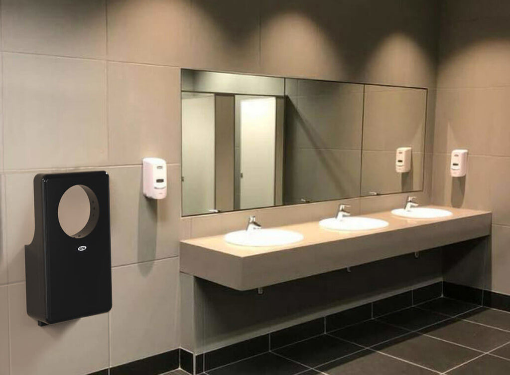 Asciugamani a lama d'aria a getto circolare. Masima igiene per l'assenza di punti di contatto con le mani e della speciale verniciatura in ABS antibatterico.