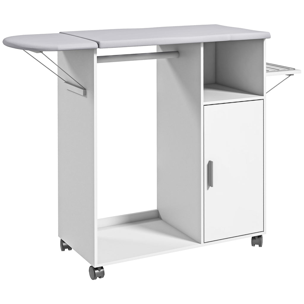 Questo mobile da stiro è in grado di offrire tutto lo spazio necessario per i tuoi vestiti. Piccolo ma completo, la struttura è composta da un ripiano portaoggetti, un armadietto a 2 livelli e uno spazio aperto per i vestiti appesi. Inoltre il mobile asse da stiro possiede un piano stirabile e ripiegabile, oltre che quattro ruote girevoli per spostarlo con facilità dove si desidera.