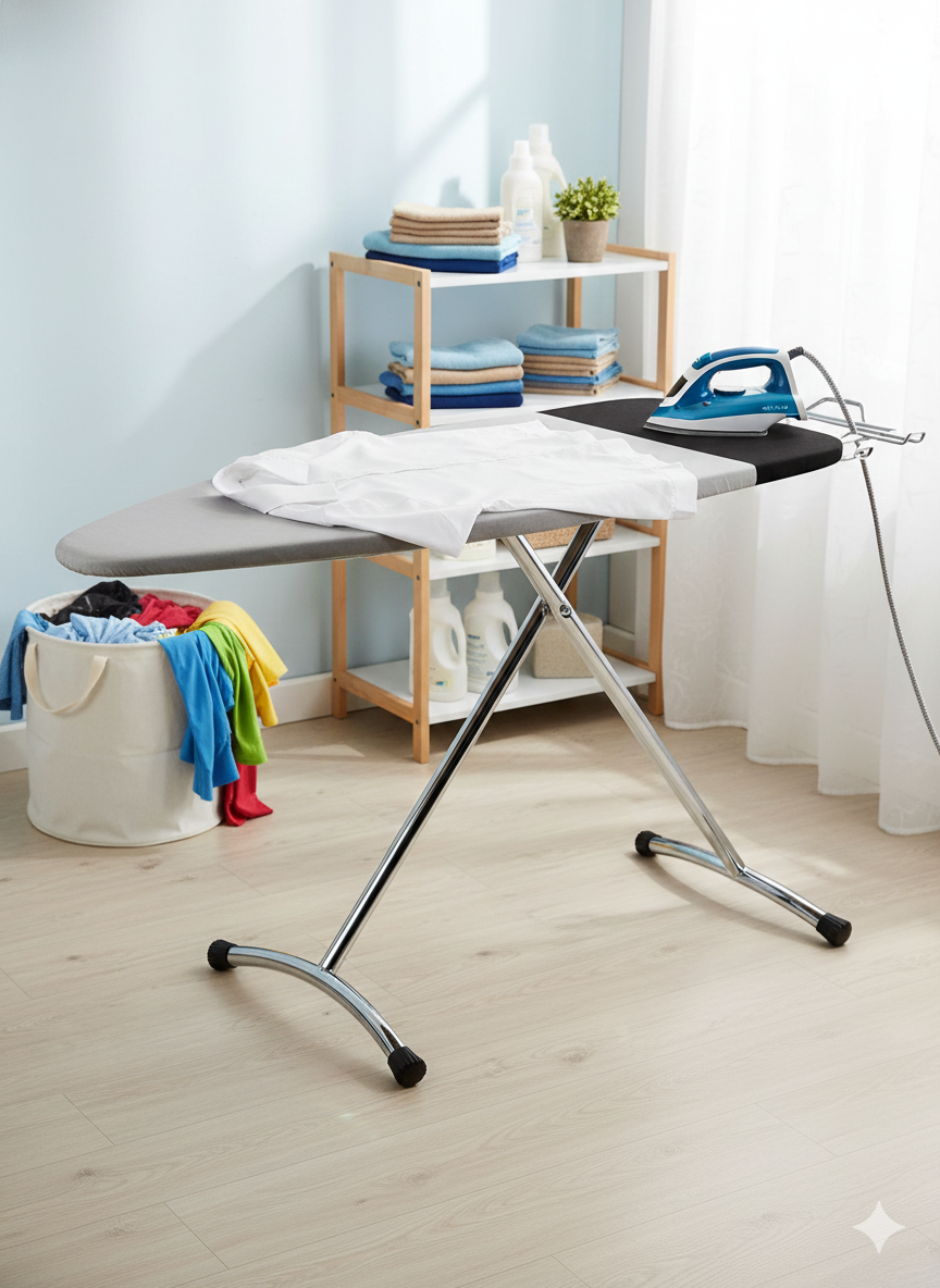 La struttura in acciaio cromato non solo conferisce un aspetto elegante, ma anche una grande stabilità e durata nel tempo. L'altezza è regolabile da 54 a 94 cm, permettendoti di trovare la posizione più confortevole per stirare senza affaticare la schiena. Le dimensioni del piano stiro di 123 x 48 cm offrono ampio spazio per stirare anche i capi più grandi.