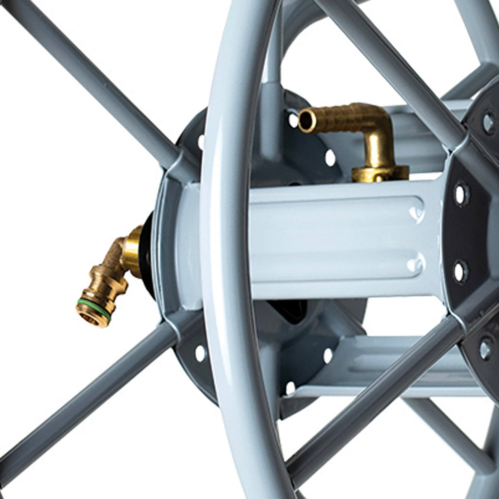 Una speciale staffa in accciaio, inclusa nella confezione, permette l'applicazione al muro dell'avvolgitubo e la rotazione sul suo asse verticale. L'avvolgitubo è facilmente rimovibile dalla staffa quando non viene usato (es. nei mesi invernali).