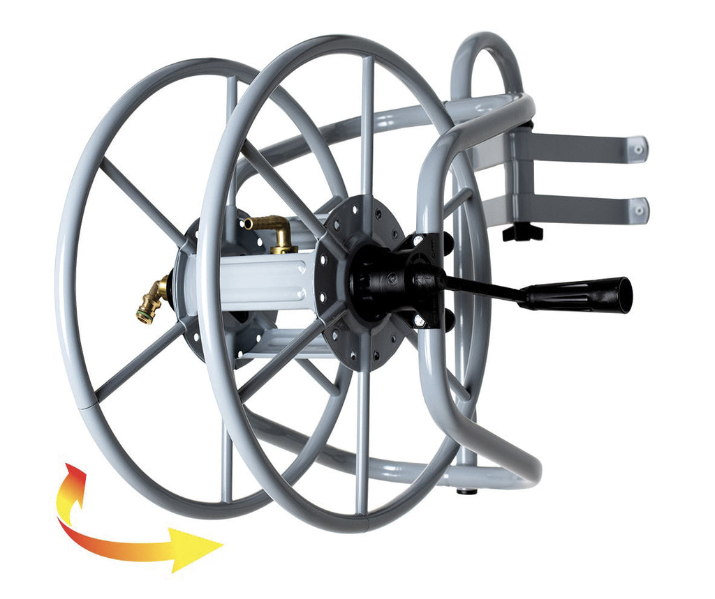 Avvolgitubo murale girevole, capacità 50 metri di tubo 1/2, fornito con raccordi di ottone realizzato in acciaio verniciato con speciale polvere poliestere atossica, per assicurare robustezza e durata nel tempo.