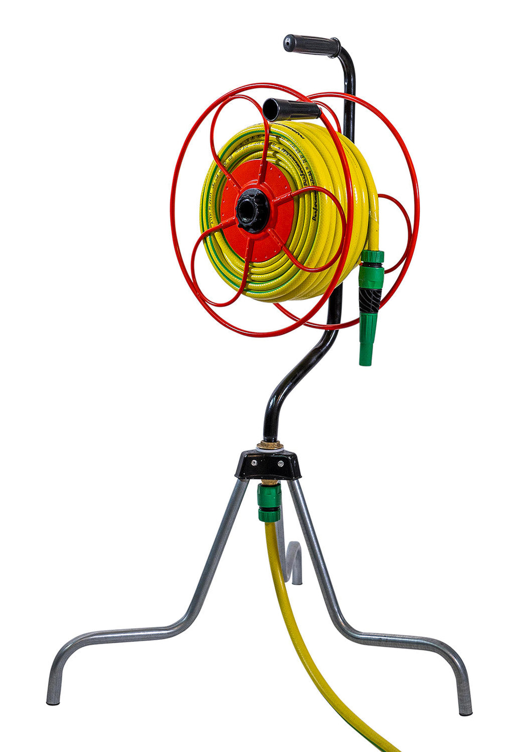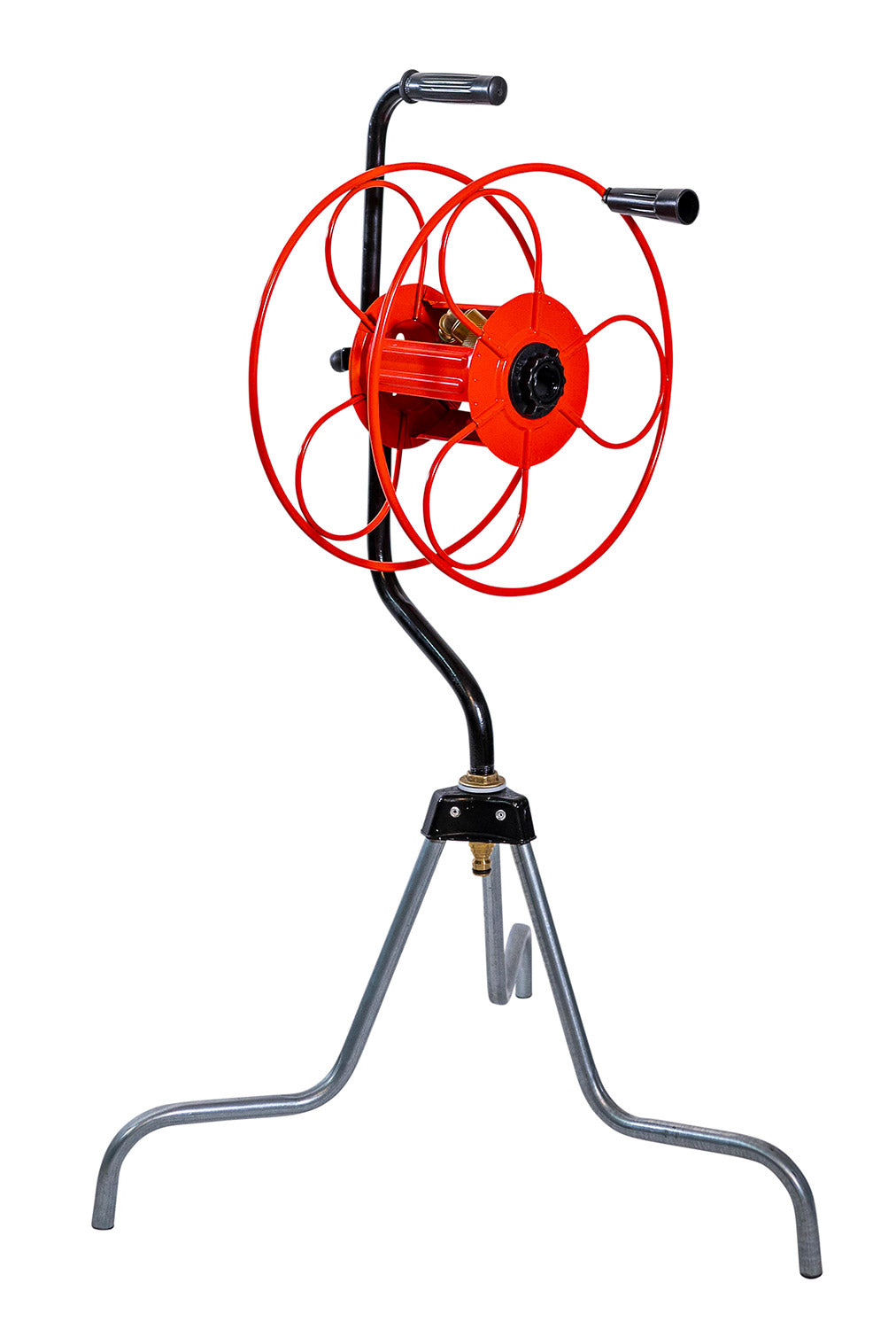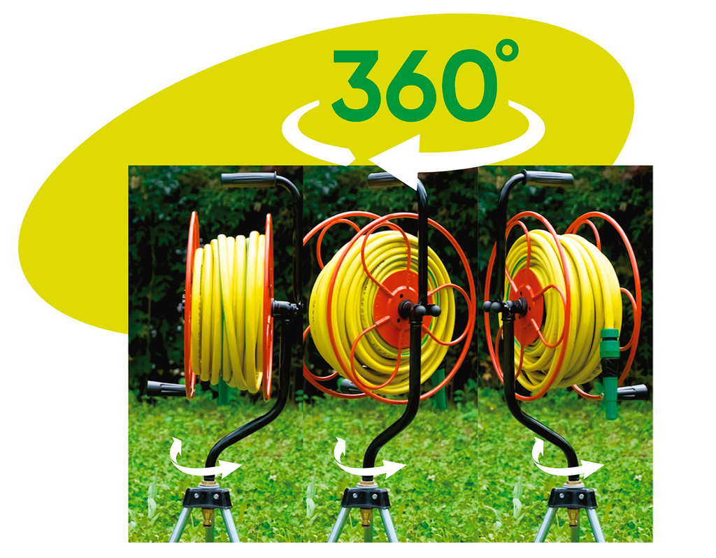 Avvolgitubo girevole su treppiede; capacità 25 metri tubo 1/2" (tubo di irrigazione, raccordi e lancia non inclusi). Il rullo avvolgitubo ruota 360° sul suo asse verticale grazie ad un cuscinetto con sfere in acciaio inox. Il tubo verticale sostiene il rullo e ne permette la rotazione a 360°; inoltre permette il passaggio dell'acqua per alimentare il tubo avvolto sul rullo. Dotato di impugnatura per l'agevole spostamento; la speciale conformazione del treppiede assicura la stabilità dell'avvolgitubo su terreni soffici e su superfici compatte