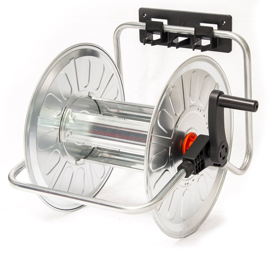 Avvolgitubo portatile/murale, realizzato in acciaio zincato: può accogliere fino a 80 metri di tubo diam. 1/2" o 50 metri di tubo diam. 3/4". Dotato di due attacchi rapidi universali. Grazie alla speciale staffa (inclusa nella confezione) questo avvolgitubo può essere applicato al muro per l'uso in postazione fissa; quando rimosso dalla staffa, questo modello può essere utilizzato come avvolgitubo portatile. Viti/tasselli per il fissaggio della staffa al muro non inclusi. Montaggio dell'avvolgitubo rapido e semplice, senza l'uso di attrezzi.