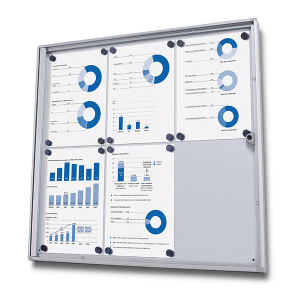 La bacheca linea magnetica è realizzata in alluminio anodizzato argentato, conferendole un aspetto elegante e moderno. La sua superficie magnetica consente di attaccare fogli e note con facilità, mentre la parte anteriore è realizzata in metacrilato trasparente con apertura a battente e chiusura sicura tramite serratura. Il kit per il fissaggio a parete è incluso, rendendo l'installazione rapida e semplice. Con un formato di 4xA4 e dimensioni di 49,1x65x2,6 cm, questa bacheca è ideale per organizzare e visualizzare documenti in ufficio o a casa.