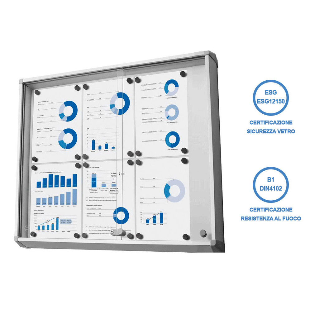 La bacheca per interni magnetica è realizzata in alluminio anodizzato di colore silver, conferendo un aspetto elegante e resistente. La sua superficie è realizzata in acciaio laccato, che la rende magnetica e anche scrivibile. Le ante sono in vetro temperato spesso 4 mm e si aprono scorrevolmente, permettendo un comodo accesso ai contenuti all'interno della bacheca. Inoltre, la bacheca è dotata di serratura per garantire la sicurezza dei documenti. Certificata come vetro temperato ignifugo classe B1, è sicura e adatta anche a ambienti con elevato rischio di incendi. Il kit di fissaggio a parete è incluso e il formato della bacheca è 6XA4, con dimensioni di 72x67,5x5,9 cm.