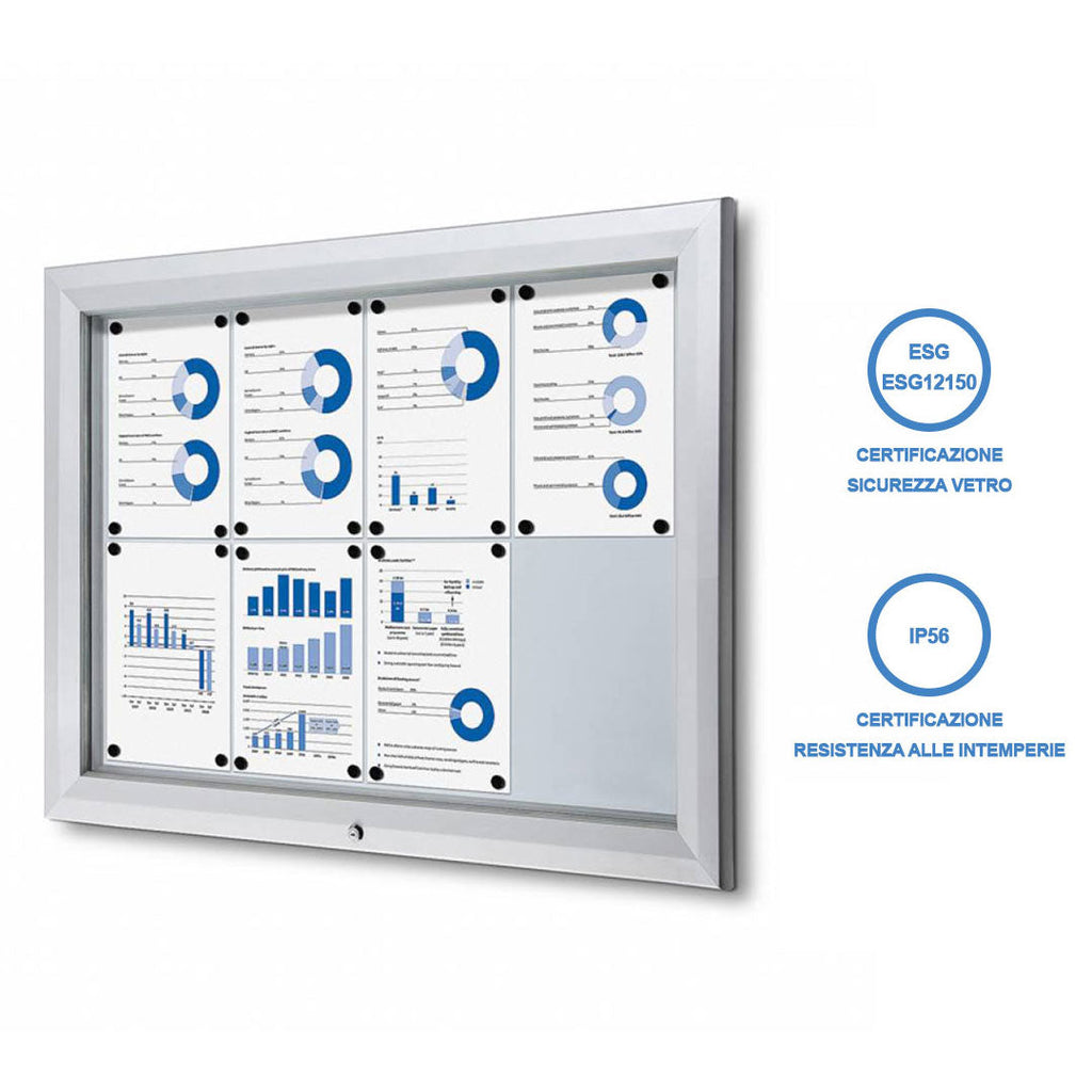 La bacheca per esterni è realizzata in alluminio estruso con spigoli arrotondati, il quale è anodizzato di colore silver. Il fondo della bacheca è magnetico, scrivibile e cancellabile, ed è realizzato in acciaio laccato bianco. L'apertura della bacheca è a ribalta, con vetro temperato e serratura, ed è fornita con due chiavi. La bacheca è certificata vetro temperato ESG e resistente all'acqua e alla polvere con indice di protezione IP56. È dotata di pistoni a gas per facilitare l'apertura e viene fornita con un kit di fissaggio a parete incluso. Il formato della bacheca è di 8xA4 e le sue dimensioni sono 102,5x76x4,7 cm.