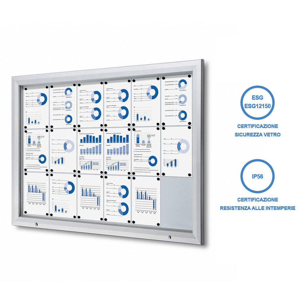 La bacheca per esterni è realizzata in alluminio estruso con spigoli arrotondati e anodizzato silver. Il fondo magnetico è scrivibile e cancellabile ed è realizzato in acciaio laccato bianco. L'apertura avviene tramite una ribalta in vetro temperato con serratura, fornita con 2 chiavi. La bacheca è certificata per il vetro temperato ESG e resiste all'acqua e alla polvere, con un grado di protezione IP56. L'apertura avviene con pistoni a gas e il kit per il fissaggio a parete è incluso. Il formato della bacheca è 18xA4 e le dimensioni sono 146,5x106,7x4,7 cm.