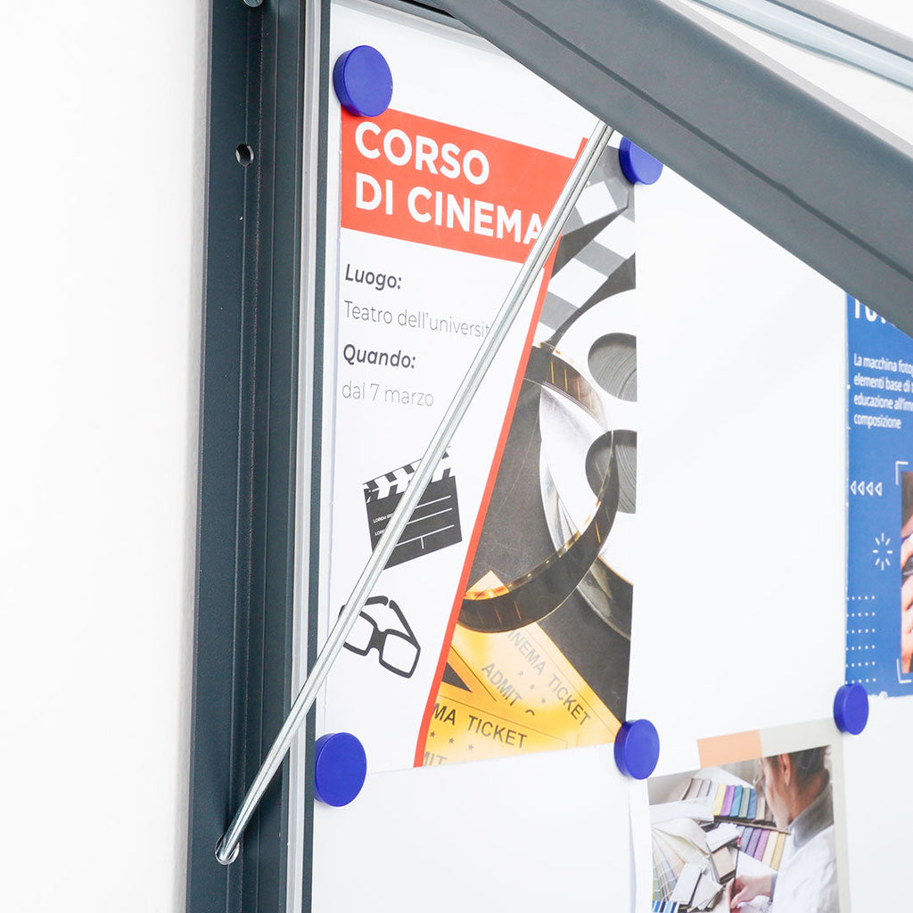 La bacheca per esterni è realizzata con materiali di alta qualità, come l'alluminio estruso, che garantiscono la durabilità nel tempo. I suoi spigoli arrotondati la rendono sicura e priva di rischi. Il suo colore verniciato a polveri grigio antracite dona un aspetto elegante e moderno. La bacheca presenta un fondo magnetico scrivibile e cancellabile in acciaio laccato bianco, che permette di scrivere e cancellare facilmente. Inoltre, la sua apertura a ribalta in vetro temperato con serratura garantisce la protezione dei documenti al suo interno. La bacheca è resistente all'acqua e alla polvere (certificazione IP56) e al fuoco (classe di resistenza B1). È inoltre dotata di pistoni a gas per facilitare l'apertura e viene fornita con un kit per il fissaggio a parete incluso. Le sue dimensioni sono di 190,5x106,7x4,7 cm, adatte per contenere fino a 24 fogli A4.