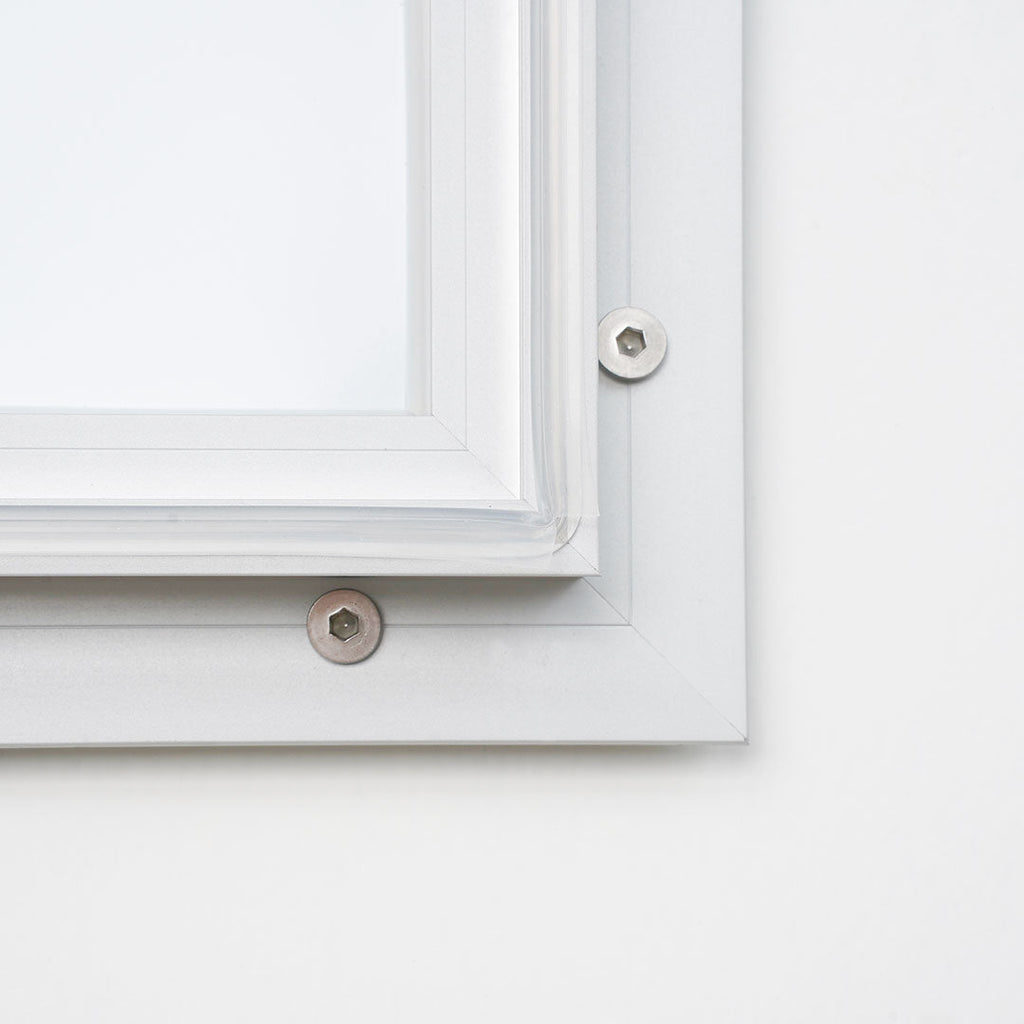 La bacheca per esterni è realizzata in alluminio estruso, con spigoli arrotondati e anodizzati in colore silver. Il fondo della bacheca è magnetico, scrivibile e cancellabile, realizzato in acciaio laccato bianco. L'apertura della bacheca avviene a ribalta, ed è realizzata in vetro temperato, dotata di serratura e fornita con 2 chiavi. La bacheca è certificata per la resistenza del vetro temperato ESG e all'acqua e alla polvere grazie al grado di protezione IP56. Viene fornita con pistoni a gas e kit di fissaggio a parete, ed ha un formato che può contenere fino a 4 fogli A4, con dimensioni complessive di 58,5x76x4,7 cm.