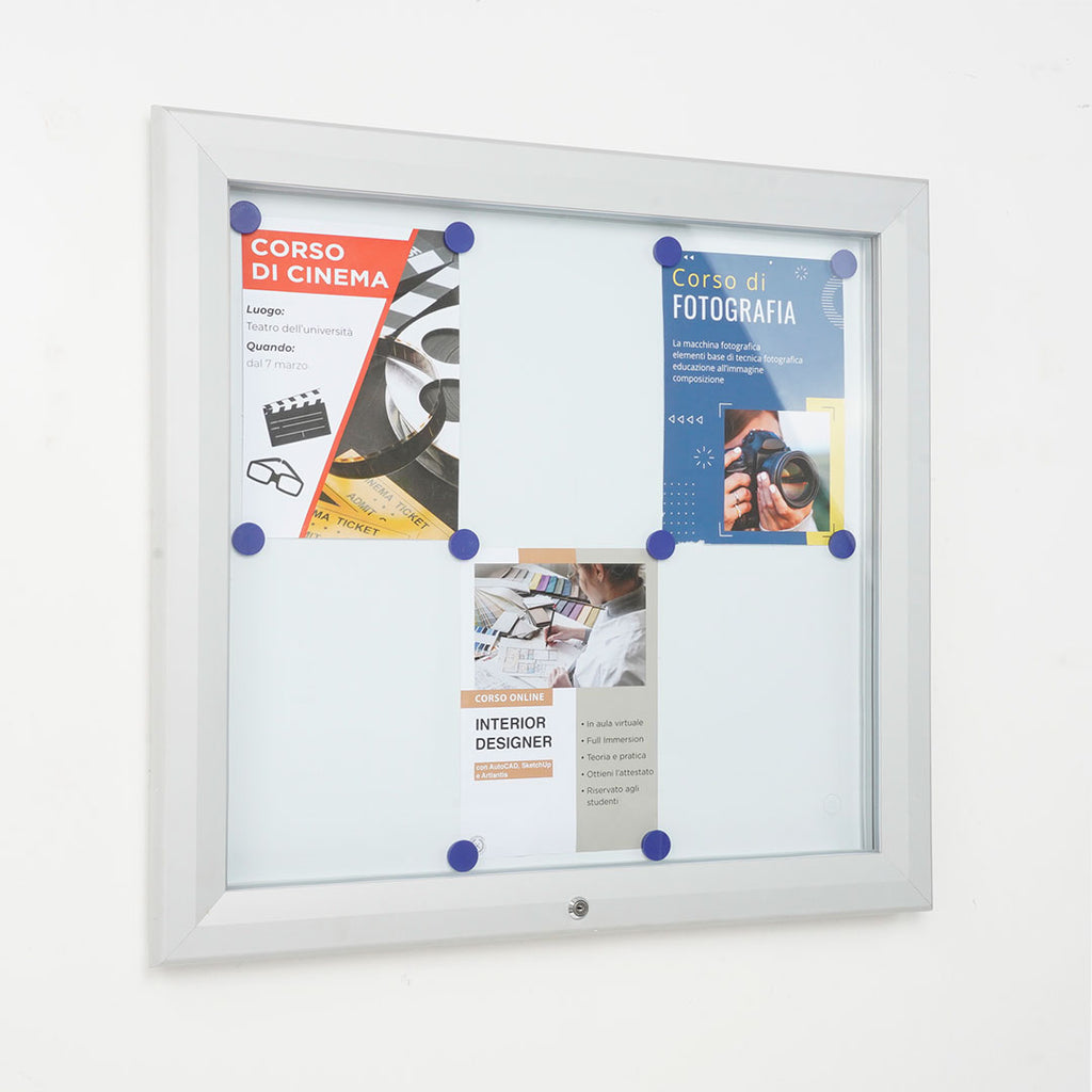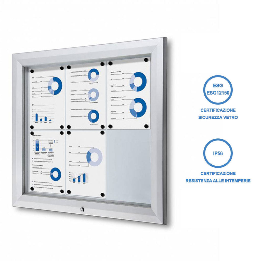 La bacheca per esterni è realizzata in alluminio estruso con spigoli arrotondati e anodizzazione silver. Il fondo magnetico è scrivibile e cancellabile, realizzato in acciaio laccato bianco. L'apertura a ribalta è realizzata in vetro temperato e dotata di serratura, fornita con due chiavi. La bacheca è certificata vetro temperato ESG e resistente all'acqua e alla polvere con grado di protezione IP56. Dotata di apertura con pistoni a gas e kit per il fissaggio a parete incluso, ha un formato che permette di contenere fino a 6 fogli A4 e misura 80,5x76x4,7 cm.