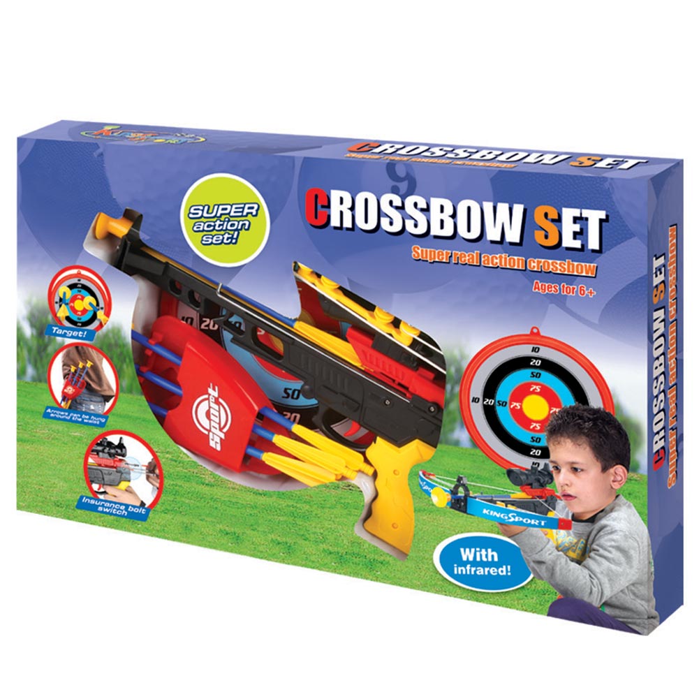 Il set è composto da una bellissima balestra molto realistica curata in ogni dettaglio e nei minimi particolari in multicolore, simile ad una vera balestra per professionisti, è dotata di mirino laser a pile per una mira perfetta e di maniglia carica arco.