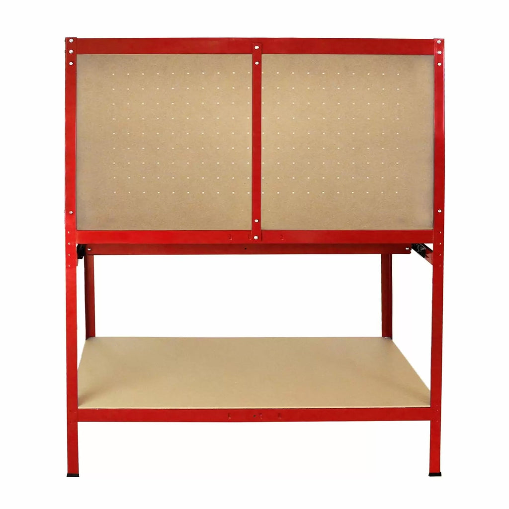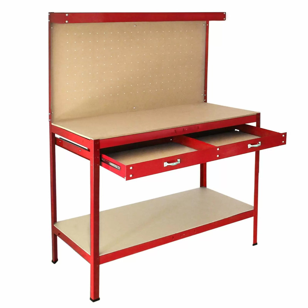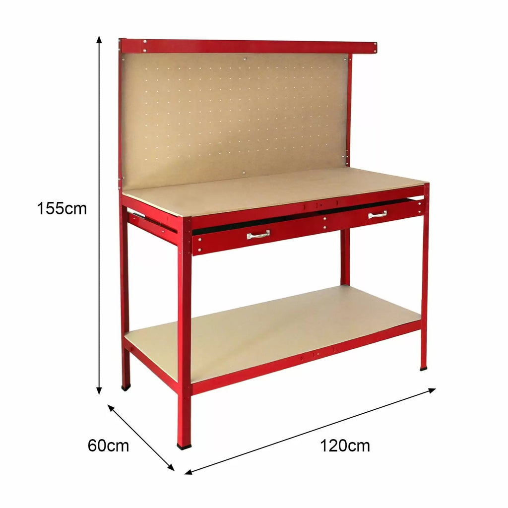 Banco da Lavoro Porta Attrezzi 120 cm in Acciaio con Parete e Cassetto Rosso
