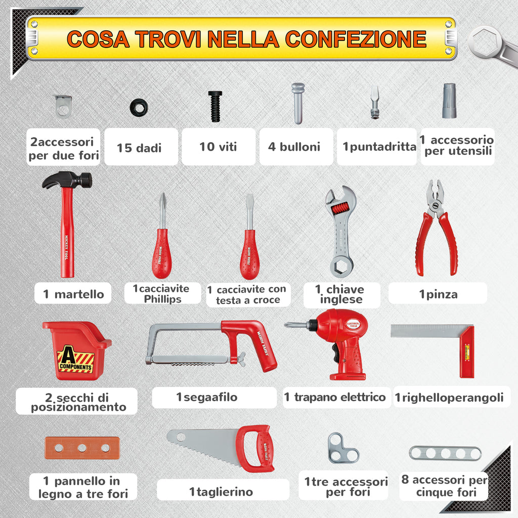 - REALISTICO: Proprio come un vero banco da lavoro ma su misura per i bambini da 3-6 anni! Ha un ampio piano di lavoro, un ripiano inferiore, un pannello su cui appendere gli attrezzi e 2 contenitori in cui sistemarli.