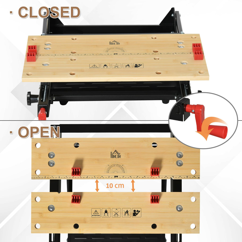 Il banco da lavoro pieghevole ti offre tutte le funzionalità che cerchi per i tuoi lavori. L'altezza del piano di lavoro è regolabile, così come la distanza fra le barre per adattarsi a ogni tua esigenza. Le barre in bambù sono dotate di 4 morsetti regolabili per fissare ogni oggetto. La struttura in metallo è solida e resistente, e con i piedini antiscivolo hai la massima stabilità durante ogni lavoro. La scelta perfetta per professionisti e principianti!