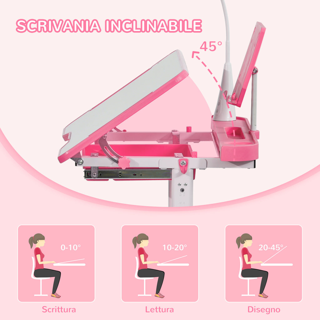 Banco Scuola per Bambini Piano Inclinabile con Luce e Sedia Regolabile Rosa