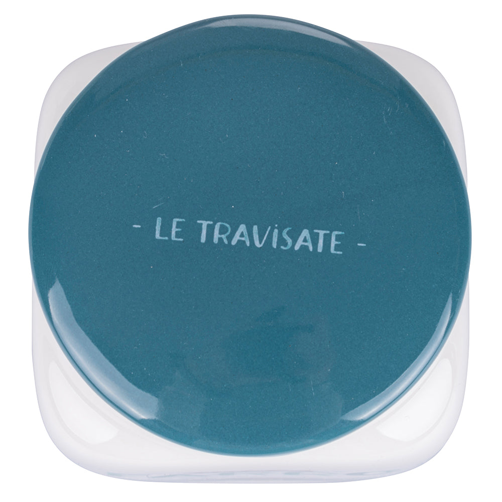 - Colore: bianco con scritte acquamarina e beige, coperchio ottanio